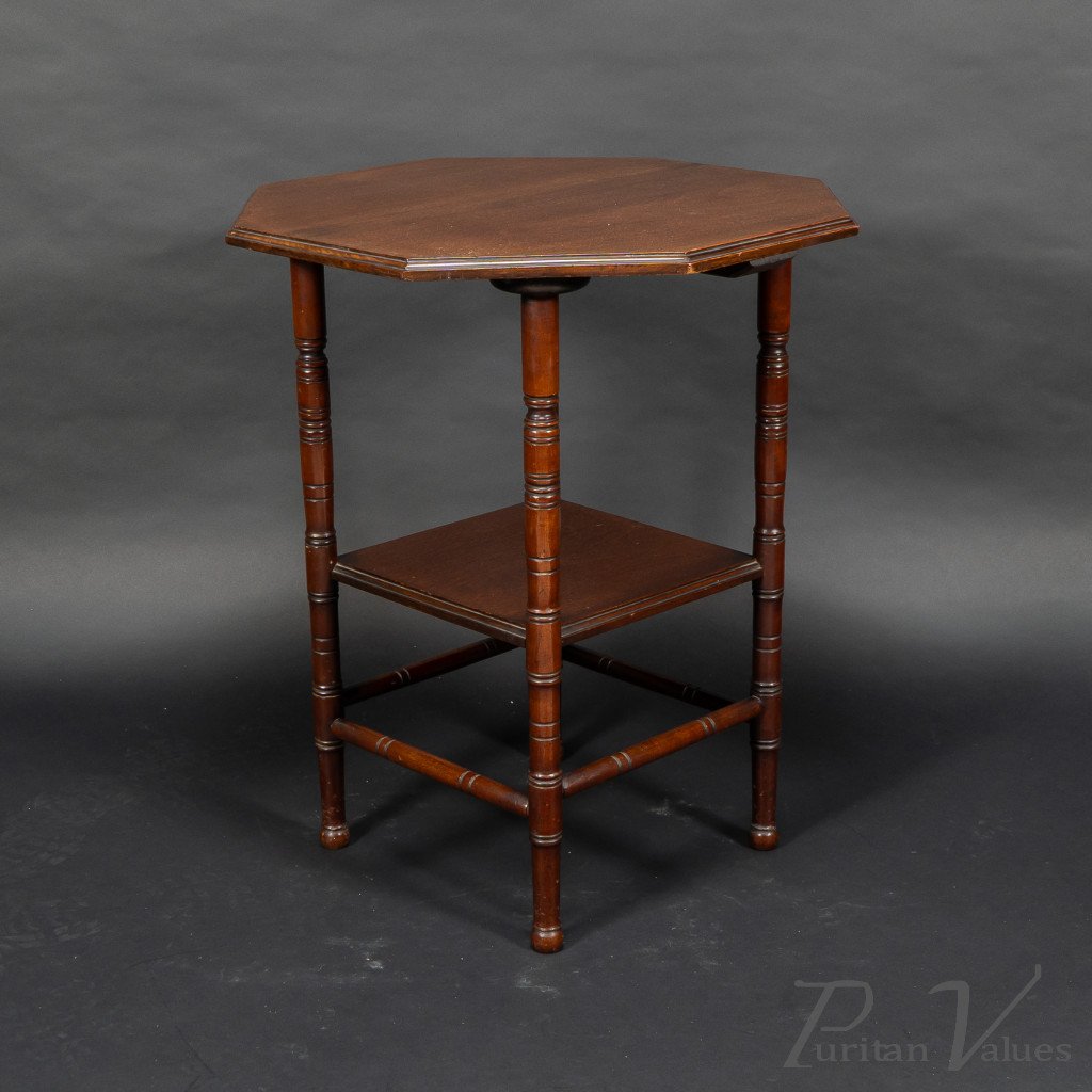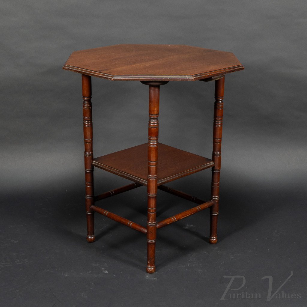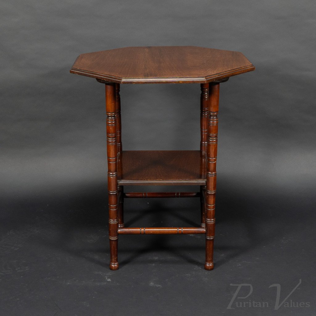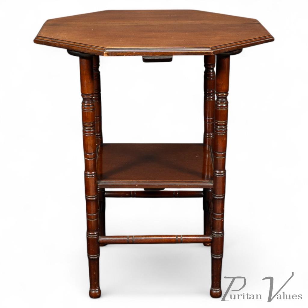 In the style of E. W. Godwin. Aesthetic Movement walnut octagonal two-tier side table with turned and incised legs uniting to the lower shelf and turned stretchers on ball-style feet.