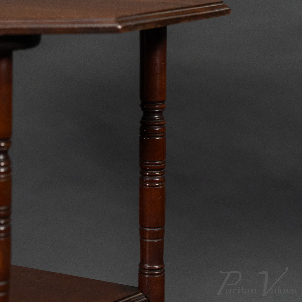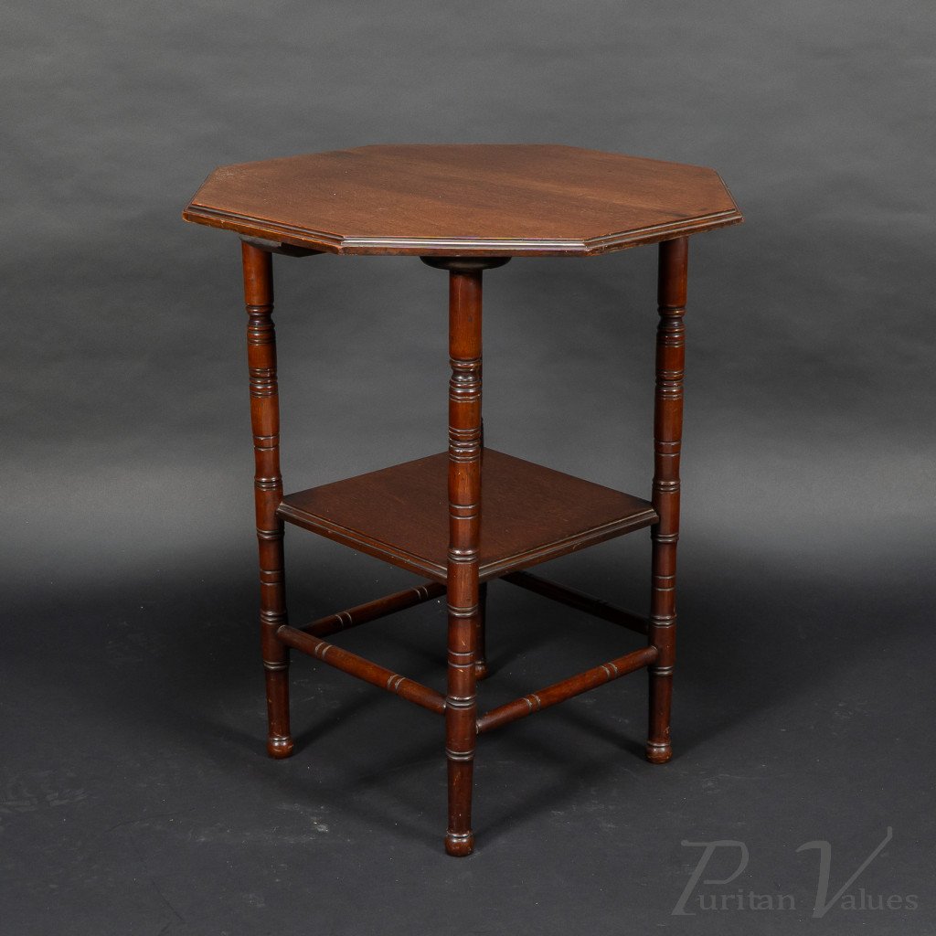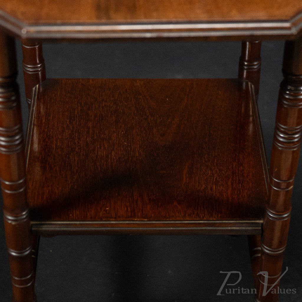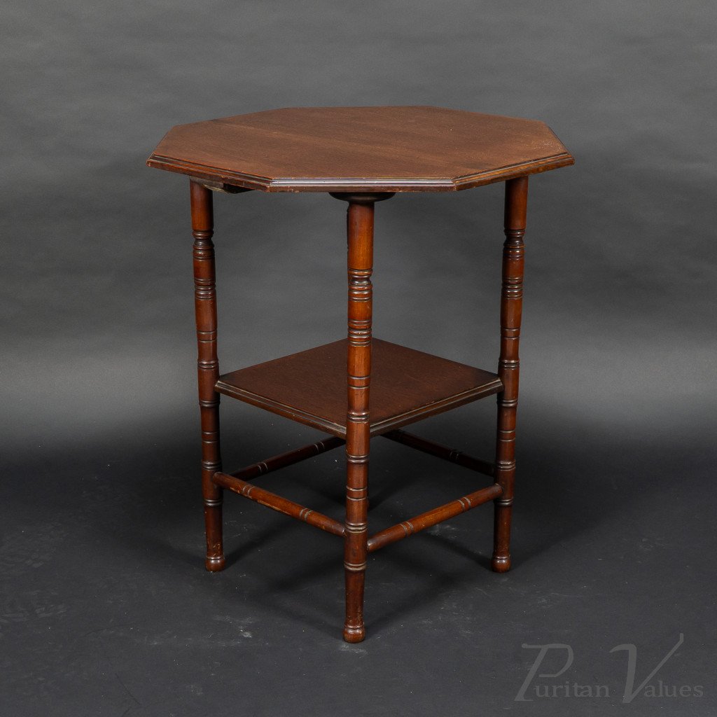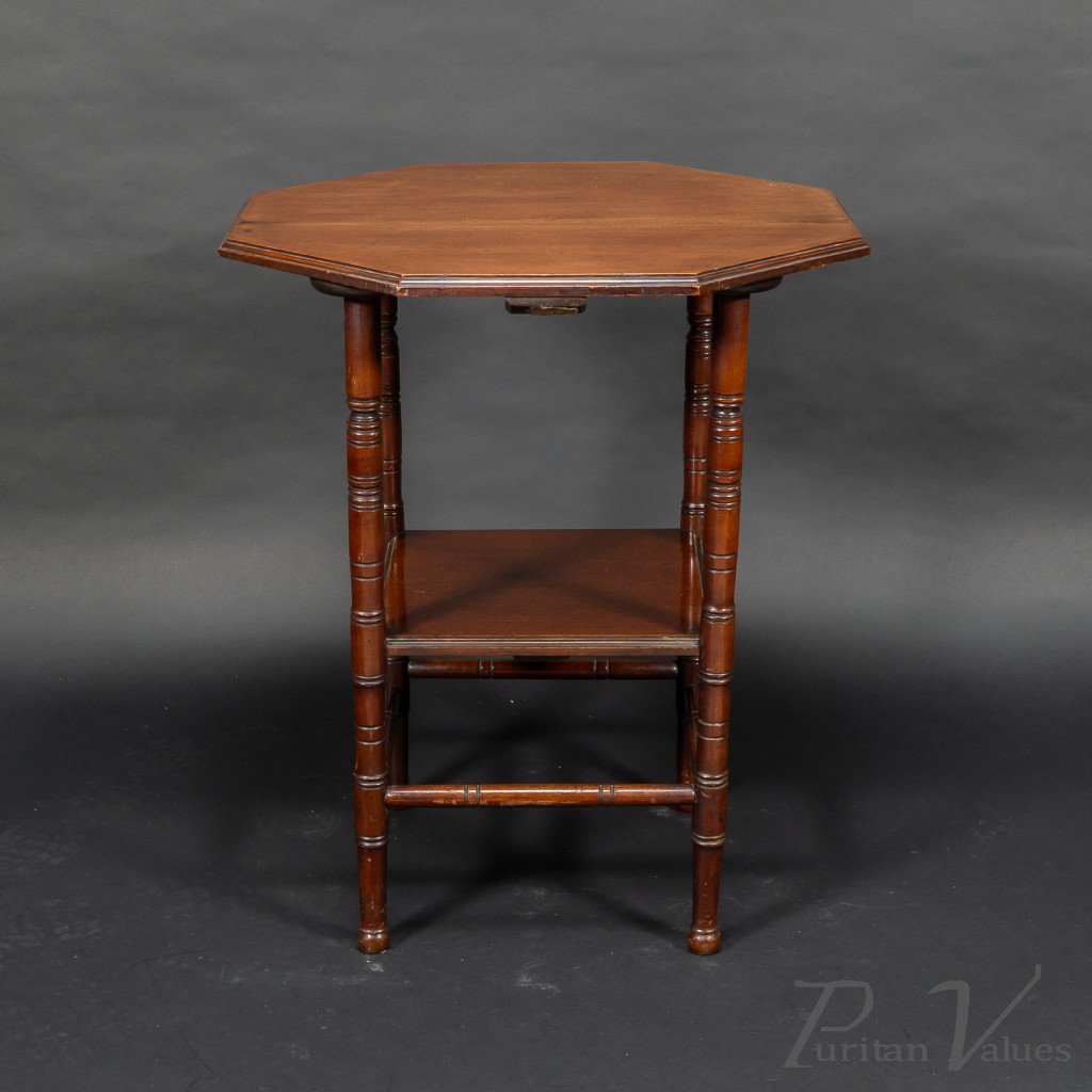 In the style of E. W. Godwin. Aesthetic Movement walnut octagonal two-tier side table with turned and incised legs uniting to the lower shelf and turned stretchers on ball-style feet.