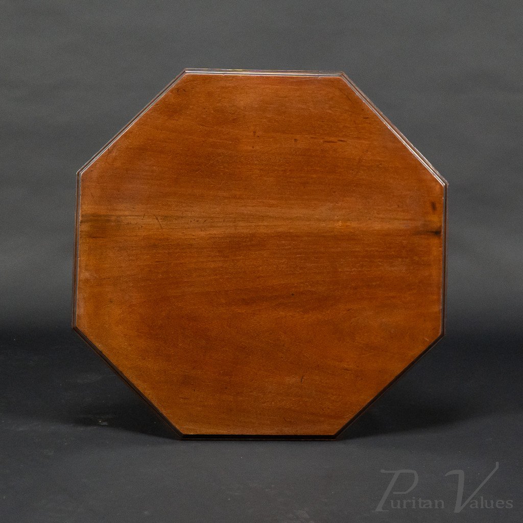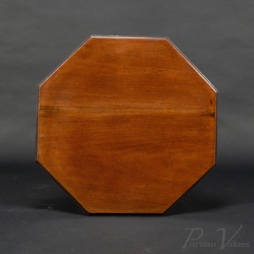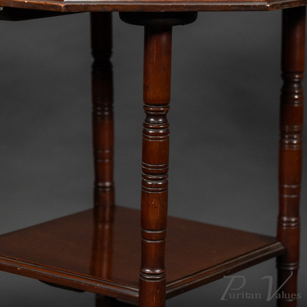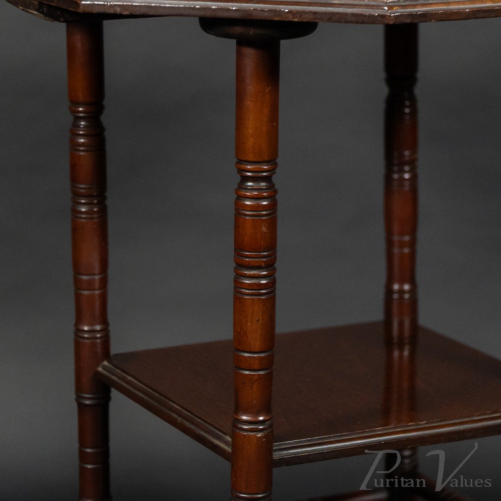 In the style of E. W. Godwin. Aesthetic Movement walnut octagonal two-tier side table with turned and incised legs uniting to the lower shelf and turned stretchers on ball-style feet.