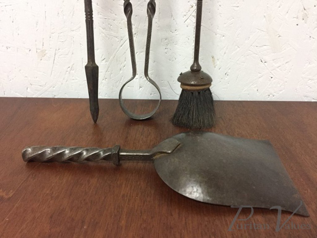 Gordon Russell. A set of Cotswold School hand wrought iron fire utensils. Dogs. Height 10", Width at feet 6", Depth 7 1/2". Poker.Height 20". Brush. Height 18". Shovel. Height 12 3/4". Tongs. Height 14 1/2".
