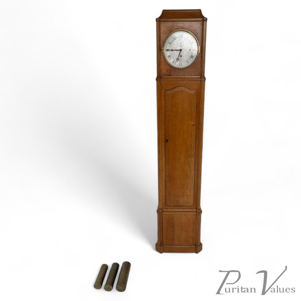 Paper label to the back of the clock which reads: Design number 27, by Gordon Russell, foreman Edgar Turner, cabinet maker F. Shilton, metal worker A. Fry, the timber used English brown oak, 18.10. 1927.