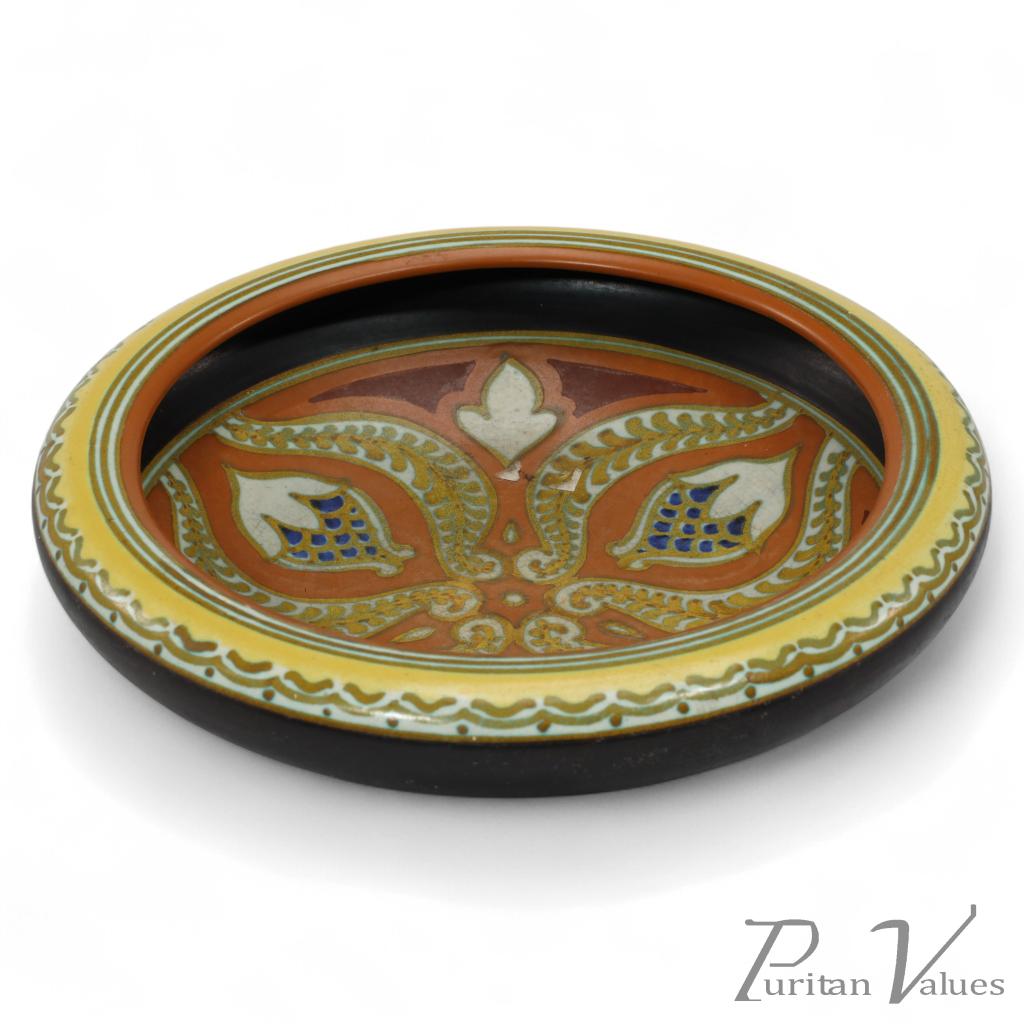 By Plateelbakkerij Zuid-Holland (Gouda Holland mark), an earthenware bowl aligned to the Art Nouveau movement (1890–1910), c.1900. Shallow circular form with a broad bevelled rim and recessed well, decorated with tube lined foliate motifs in ochre, olive, white and cobalt on a terracotta ground. The base carries a blue Gouda Holland mark with painted numerals consistent with early PZH production.