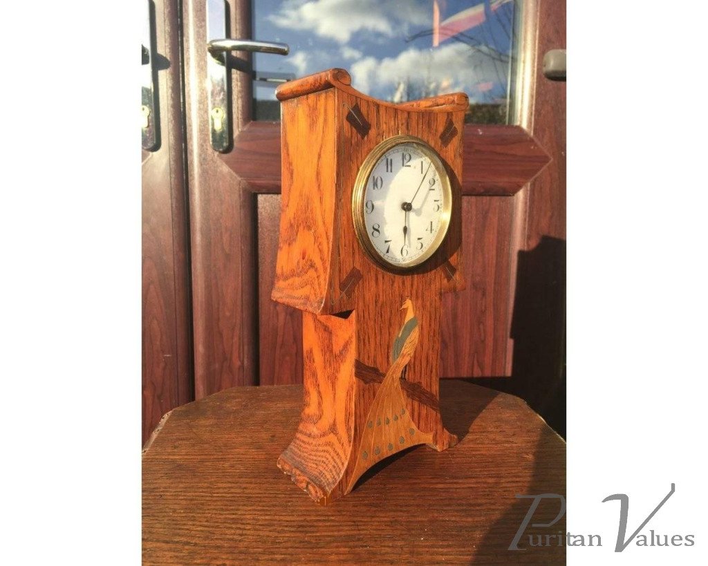 Guild of Handicraft Attri, Arts & Crafts Oak Mantel Clock with Inlaid Peacock