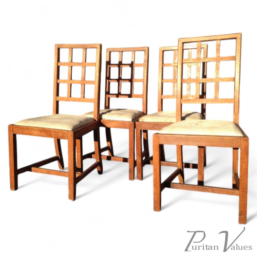 Heals of London. A set of four Arts and Crafts oak lattice back dining chairs