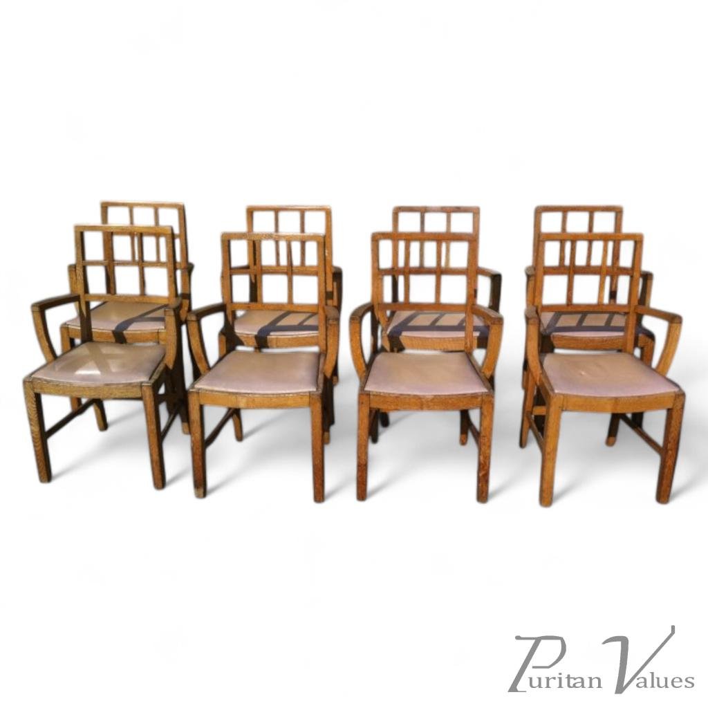 Twelve Lattice back oak armchairs attributed to Heals of London. The arms sit back further than usual allowing them to be pushed closer to the dining table or desk. I have 8 left in stock and will sell individually. Height 36". Depth 19 1/2", Width at arms 22 1/4" Height of arms 26", Length of arms 13 1/2", Height of seat 18".