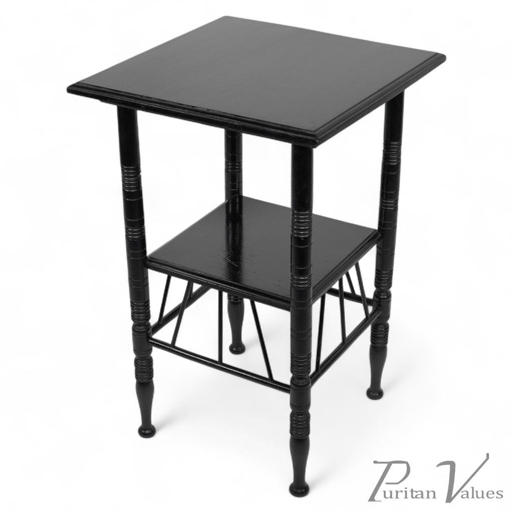In the style of Edward William Godwin, an ebonised side table aligned to the Aesthetic Movement (1860–1900), c.1885. The square top sits over a matching undertier on four ring-turned legs; rectilinear lattice stretchers brace the frame; small turned feet complete the profile. The pared geometry, ebonised finish and Anglo-Japanese vocabulary reflect late nineteenth-century domestic furniture.