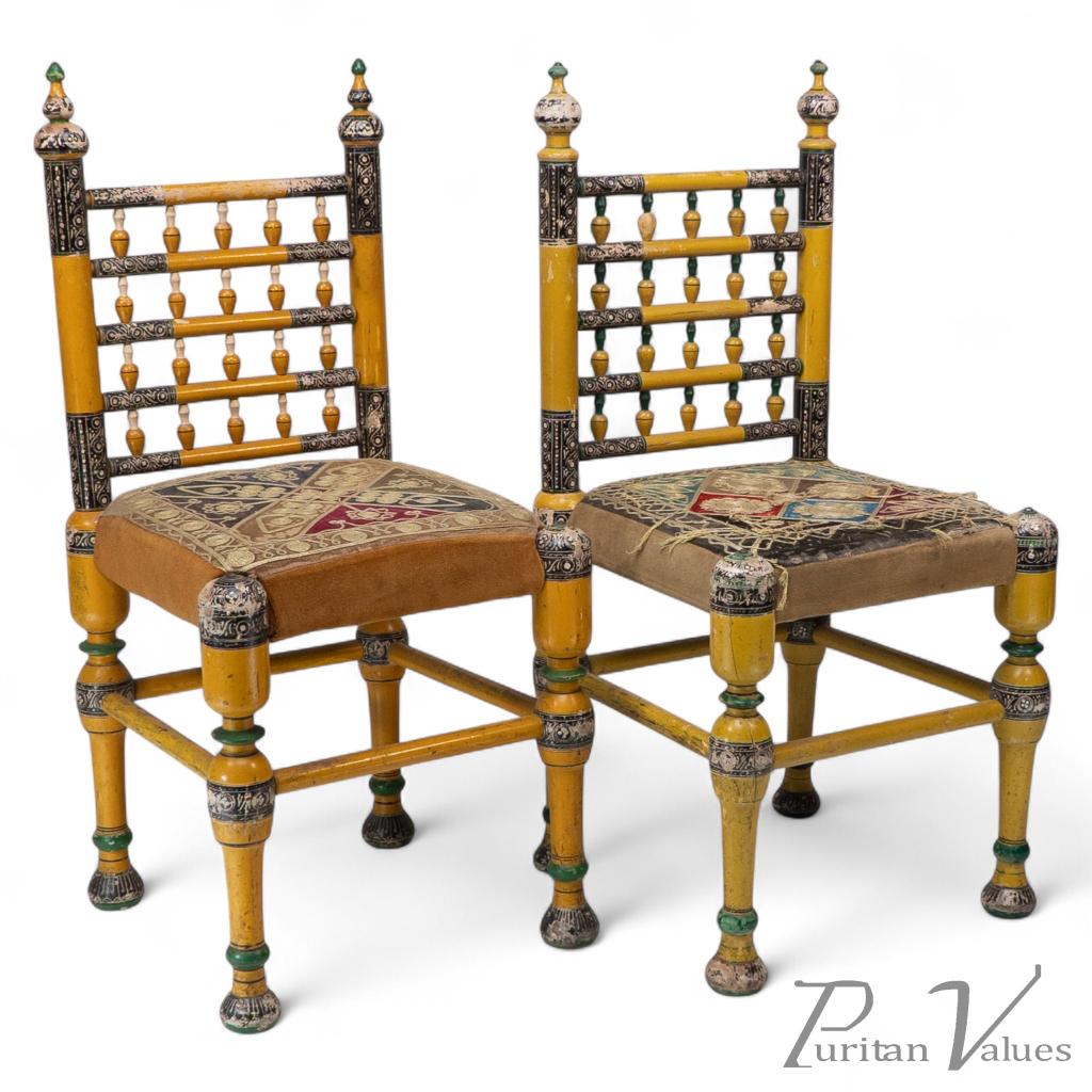Indian Rajasthani a Pair of Polychrome Painted Chairs with Gilt Chord Embroidery