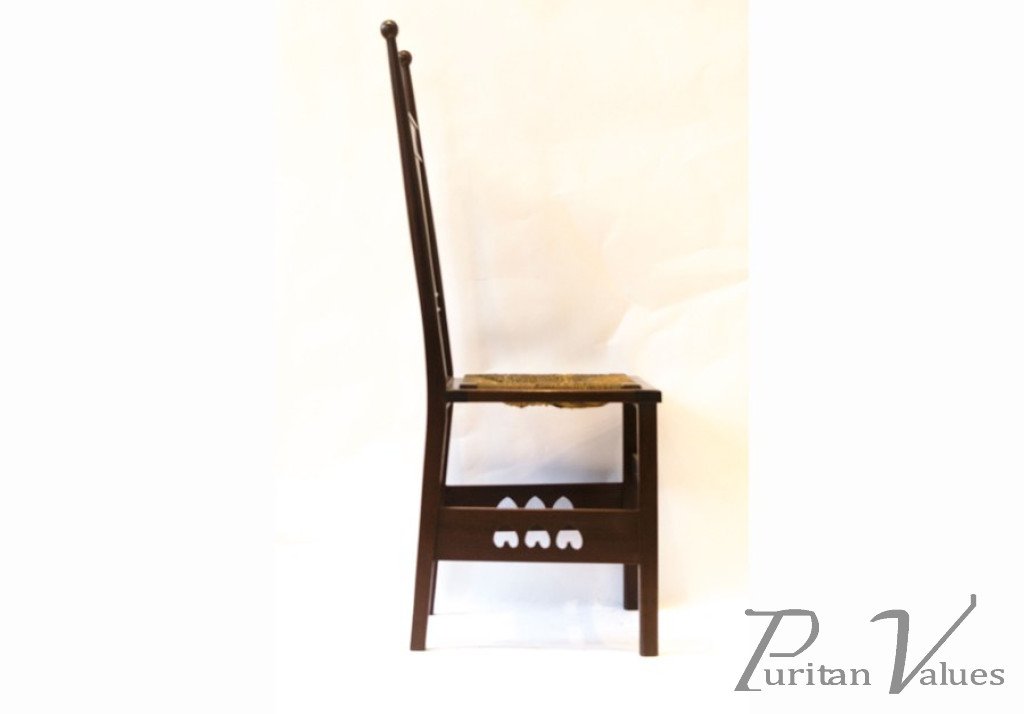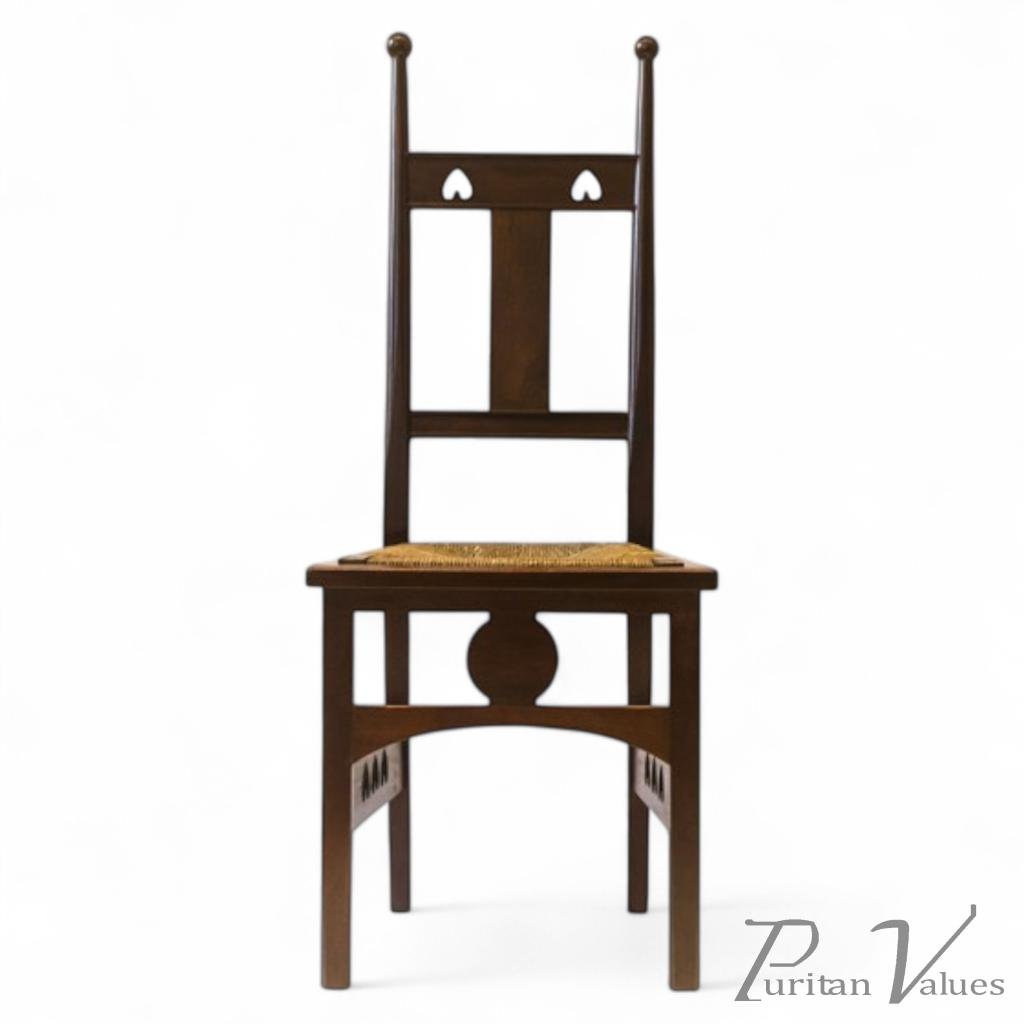 A stylish pair of Arts and Crafts mahogany side chairs by J S Henry. With elongated uprights and ball finials and stylised heart cut-outs to the back and to the sides with original rush seats. I have two pairs one pair here in mahogany and another pair in oak. Circa 1900. Pair SOLD