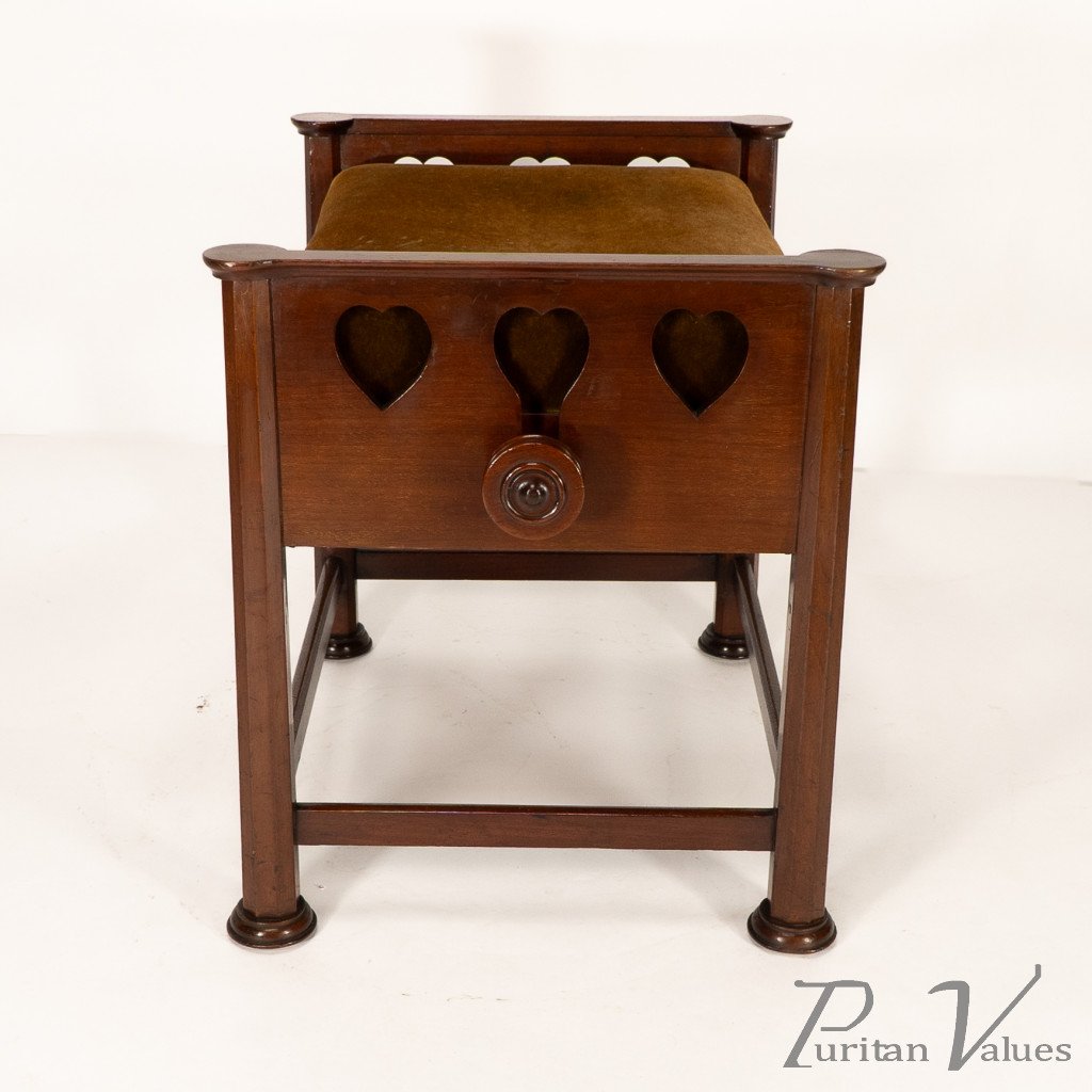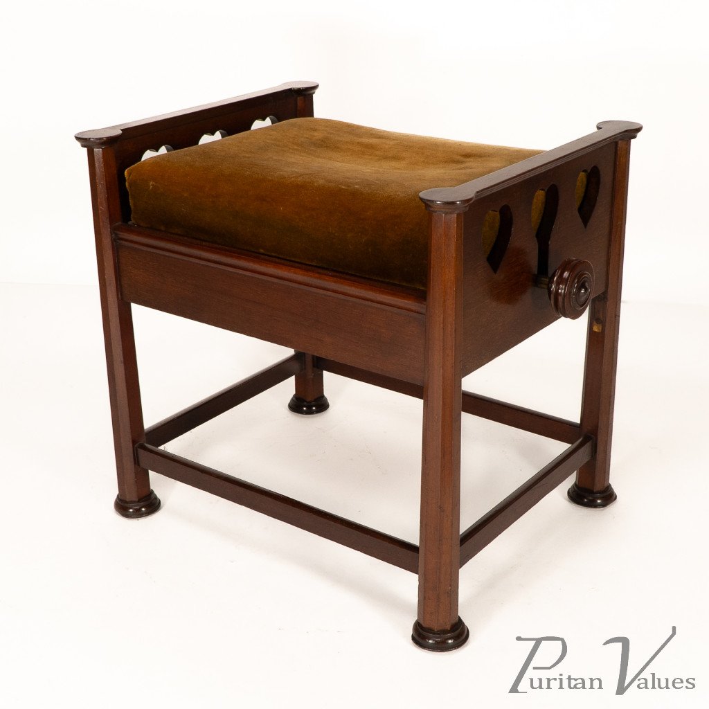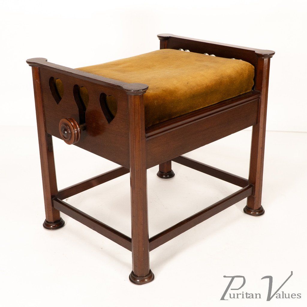 An Arts and Crafts walnut adjustable piano stool with pierced heart decoration to the sides, with extended round height adjustable handles to each side connecting to a cast iron "Brooks adjustable seat mechanism." Standing on octagonal legs with pad feet.