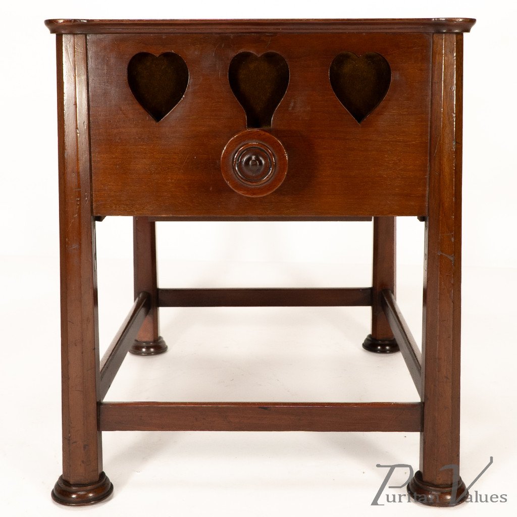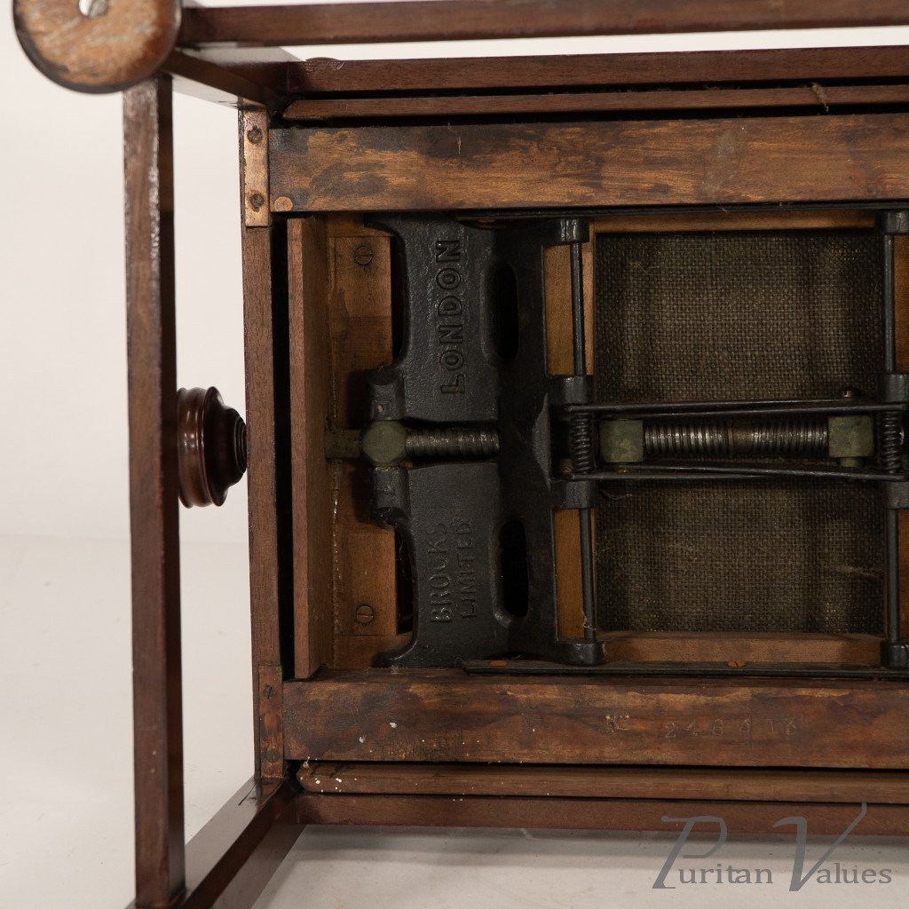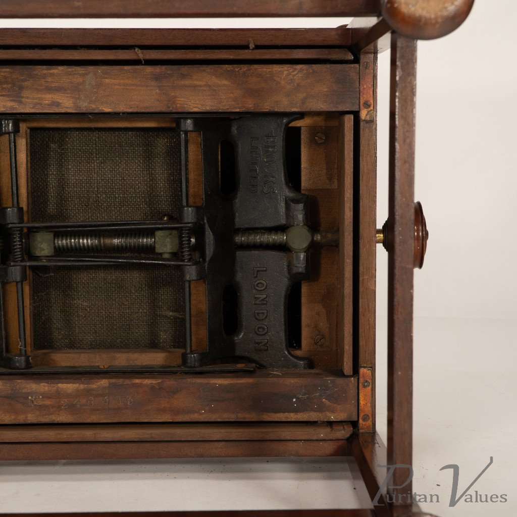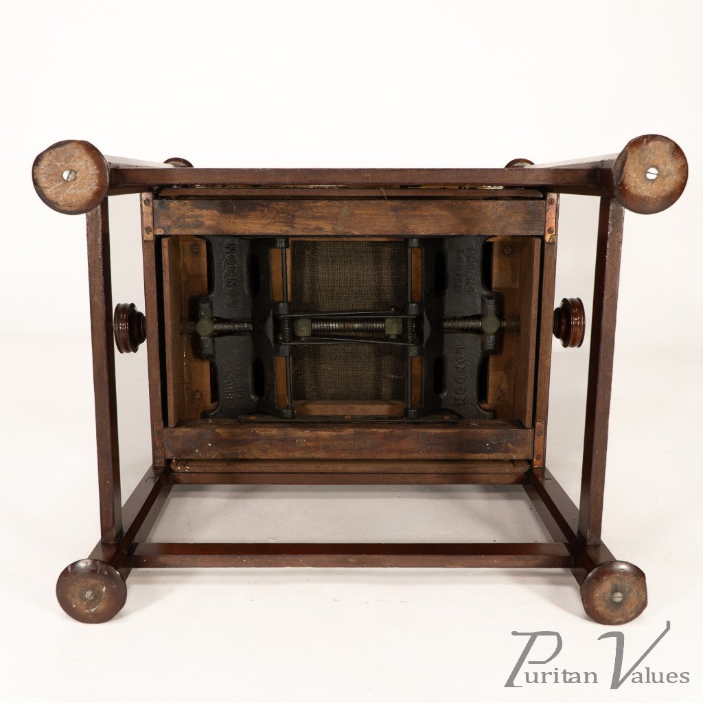An Arts and Crafts walnut adjustable piano stool with pierced heart decoration to the sides, with extended round height adjustable handles to each side connecting to a cast iron "Brooks adjustable seat mechanism." Standing on octagonal legs with pad feet.
