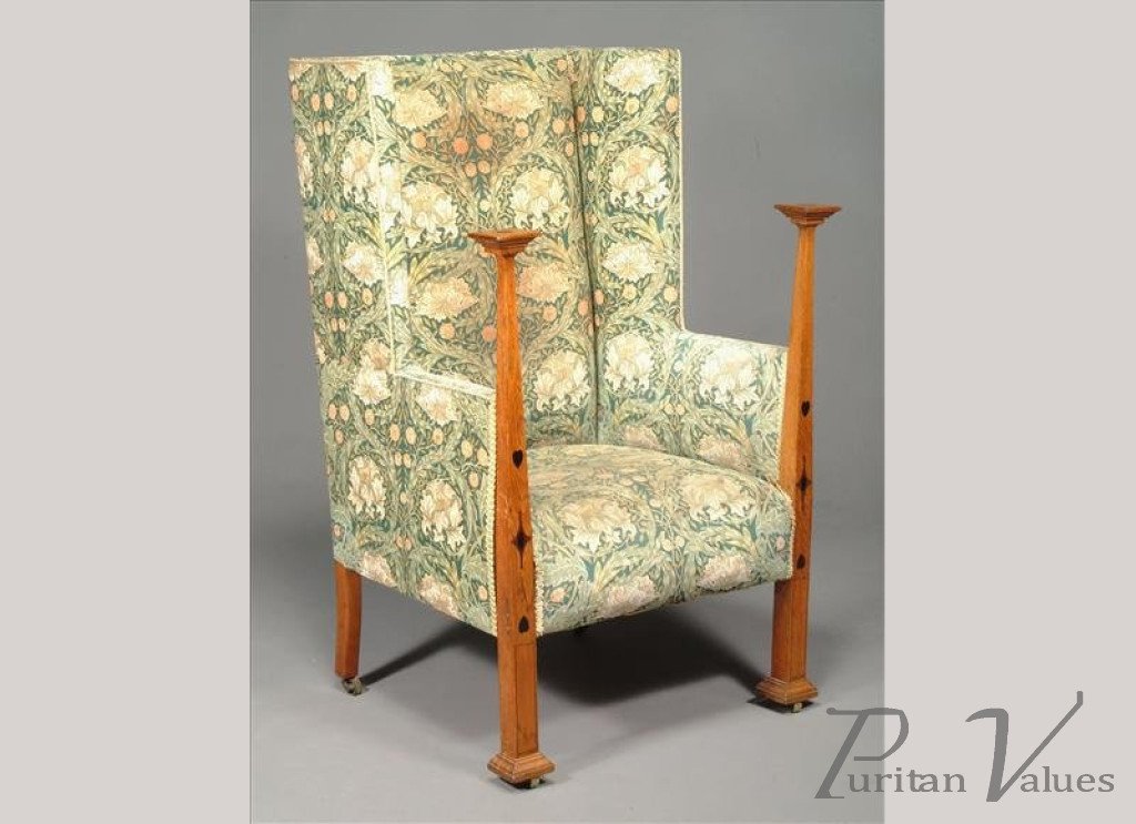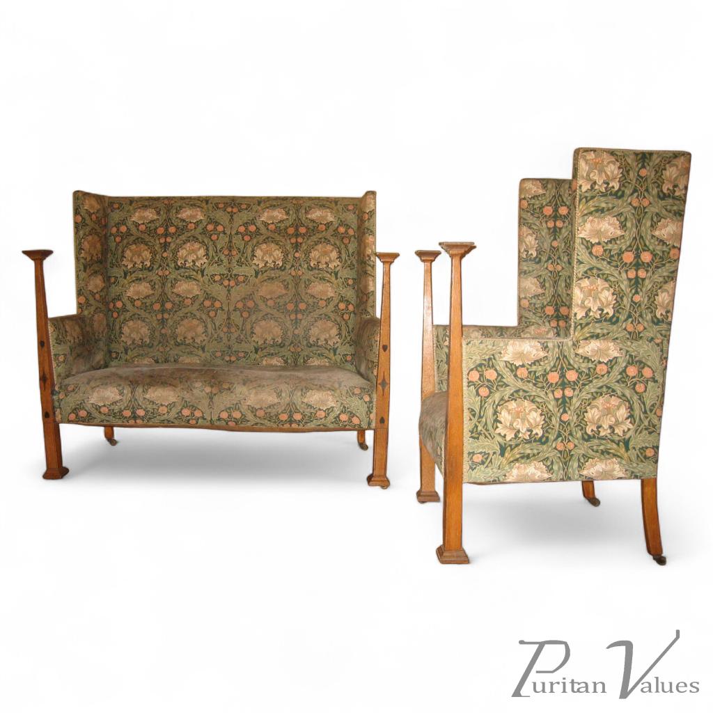 J.S. Henry (attributed). An oak and inlaid sofa and armchair, the elongated front supports with square caps, the settee frame only, the chair re-upholstered in a William Morris print, sofa 121cm high, 144cm wide, 75cm deep; the chair 121cm high, 77cm wide, 71cm deep.