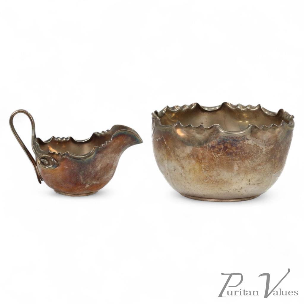 A silver plated sugar bowl and milk jug, the jug with a trumpet style flower to the handle.