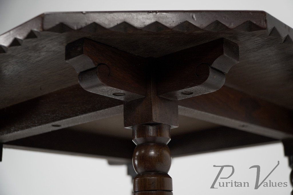 James Plucknett attributed probably for Collier and Plucknett. A fine quality aesthetic movement walnut side table with chip carved 45-degree details to the underside of the top and very precise scroll carved details to the protruding top supports. The legs with square, turned detail and octagonal details united by the lower shelf and four turned stretchers below. Measures: