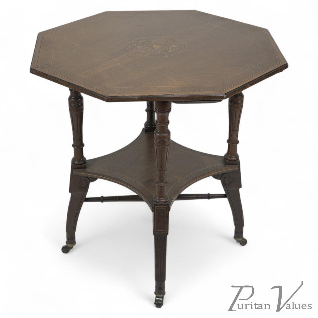 An Aesthetic Movement octagonal rosewood side table with fruitwood stylized inlays to the top and string inlay to the top shelf and legs, carved circular details to the legs, united by lower cross stretchers.