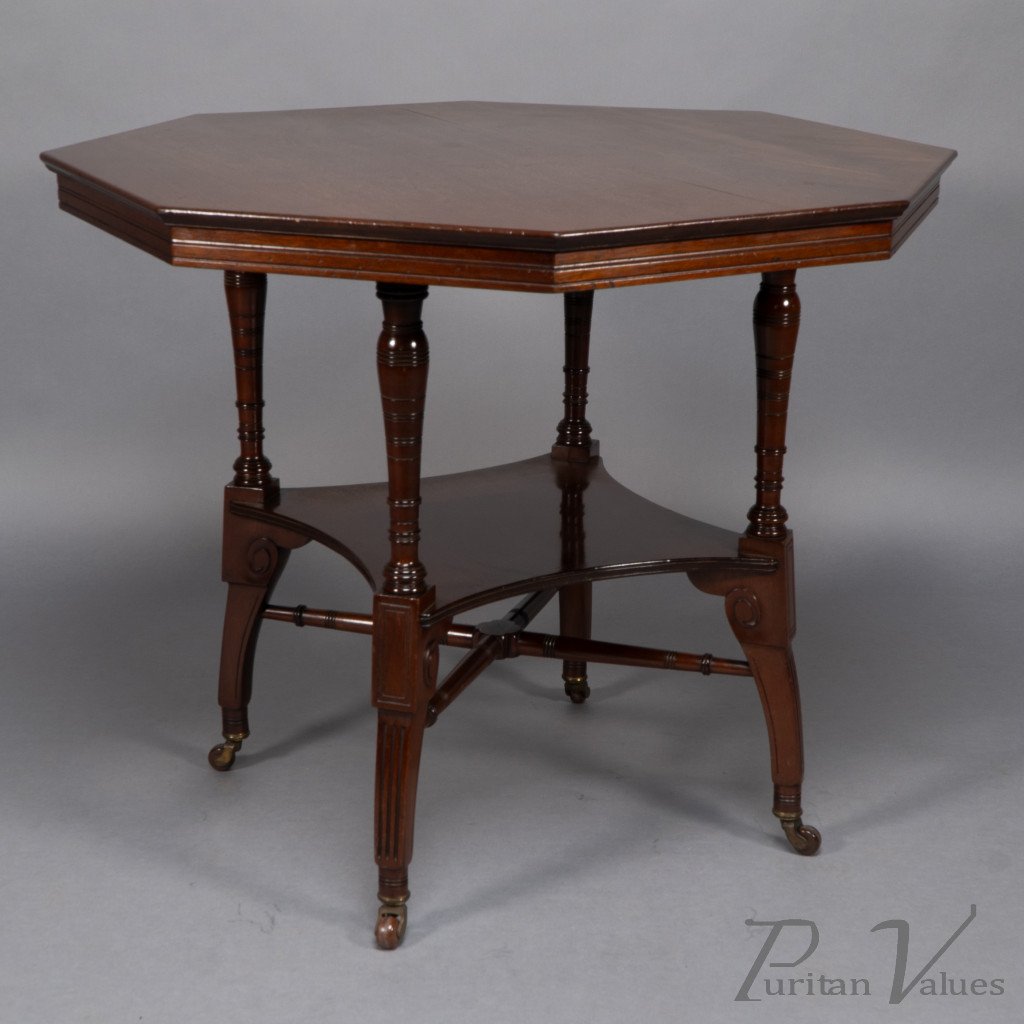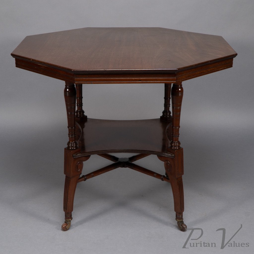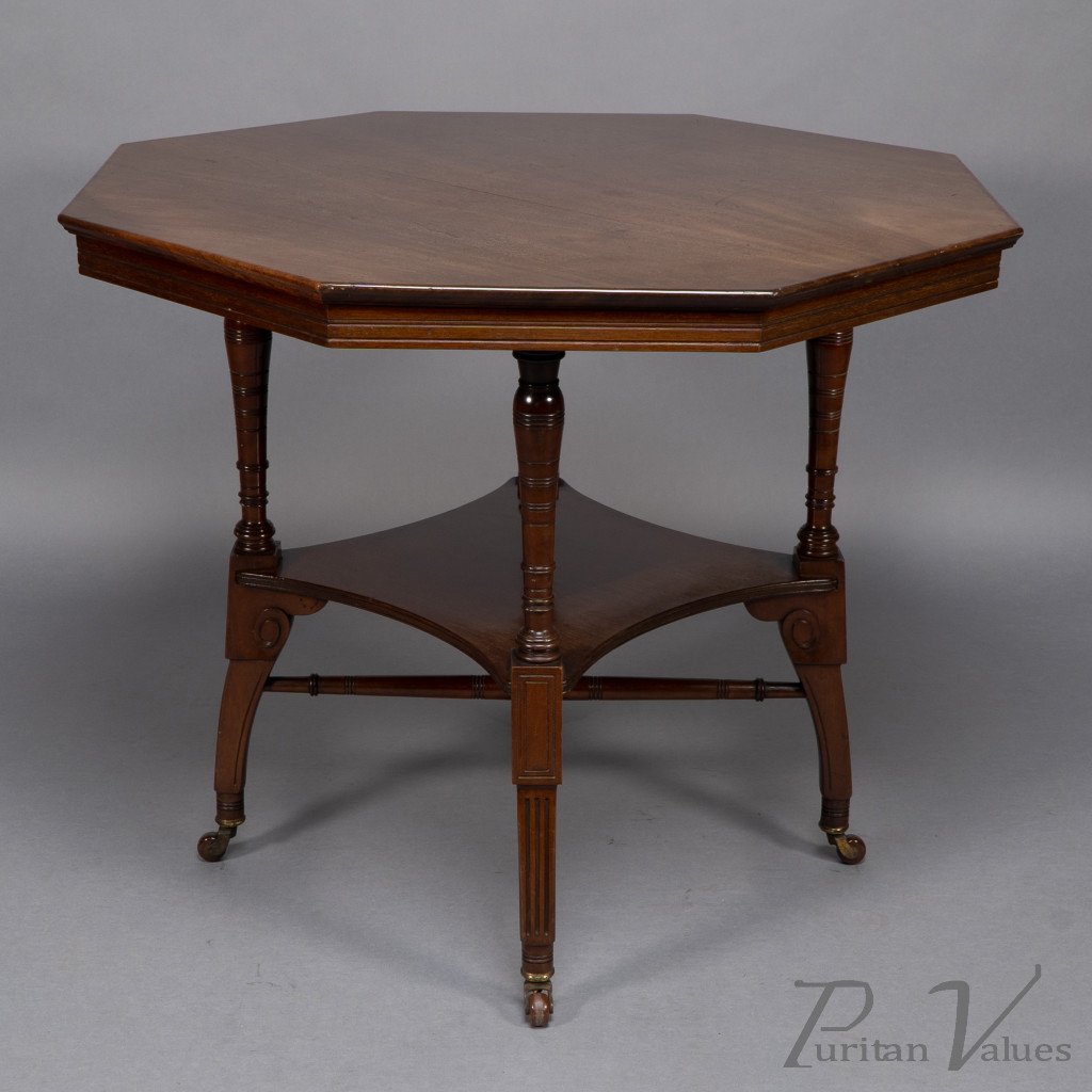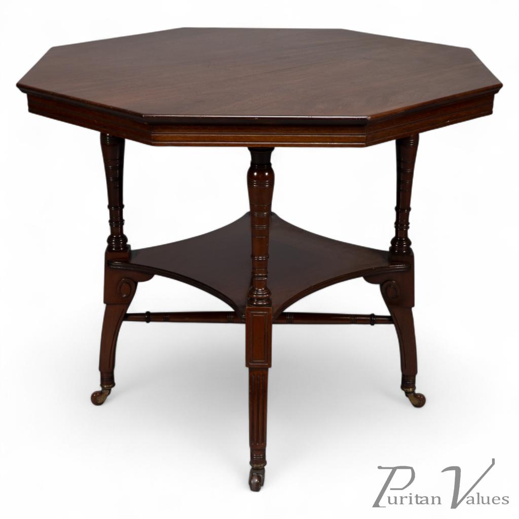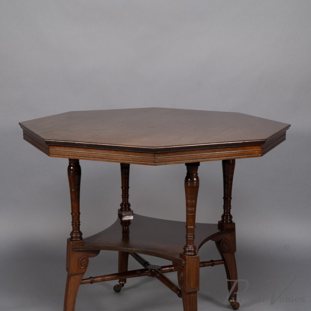 This Aesthetic Movement octagonal centre table attributed to Jas Shoolbred dates to around 1880 and exemplifies the refined domestic furniture that defined the late Victorian aesthetic. The octagonal top rests above an under-tier shelf supported by finely turned stretchers and elegant reeded legs, creating a harmony between geometry and proportion.