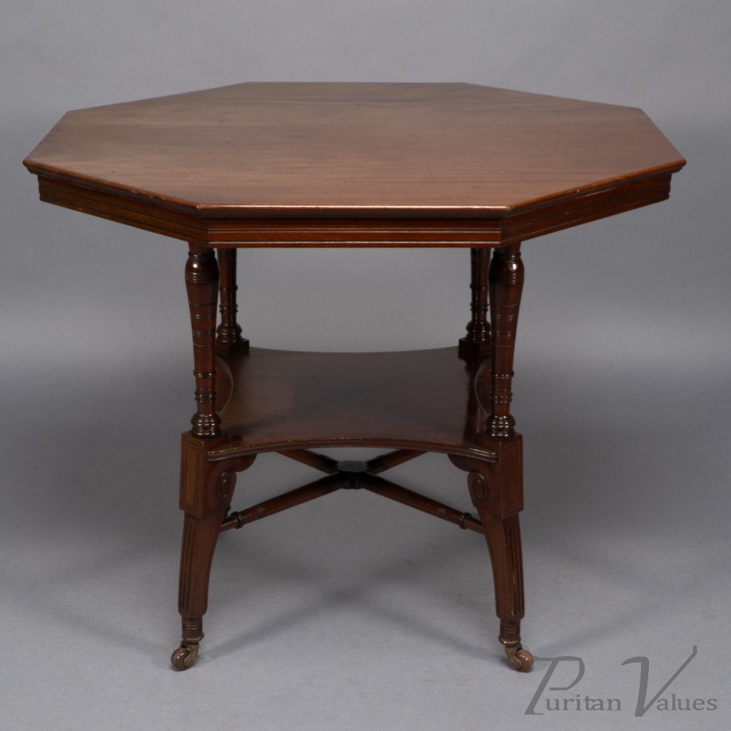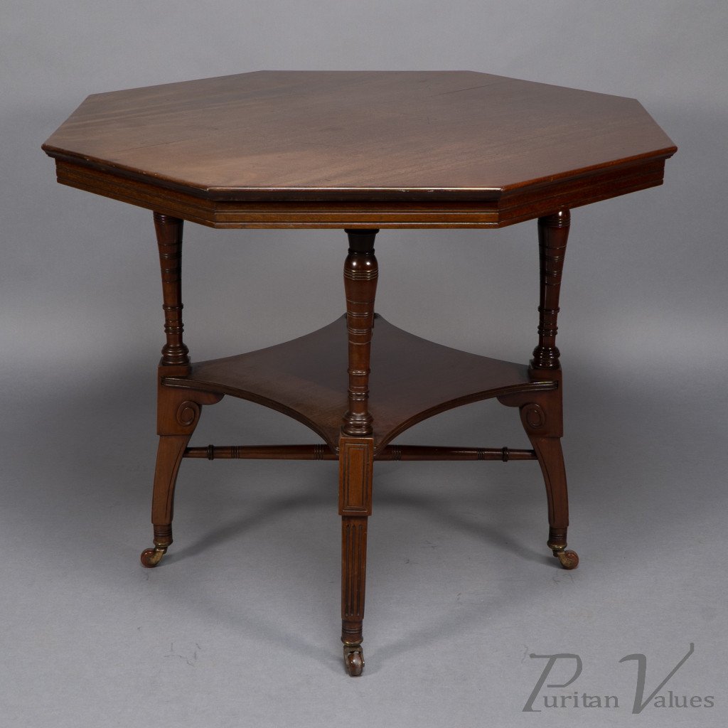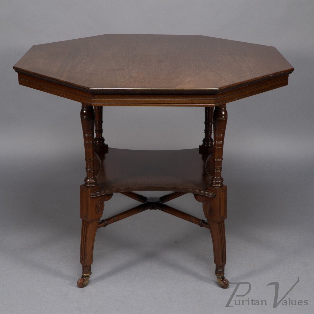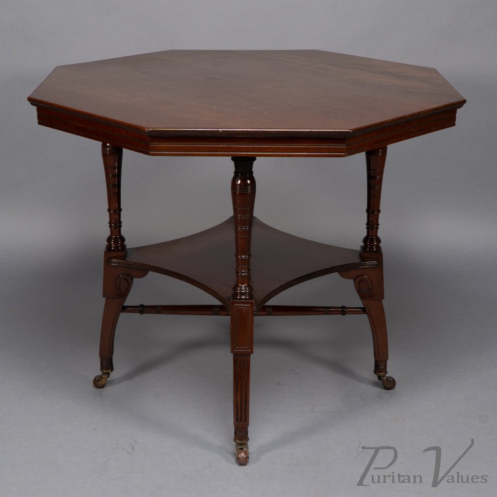 This Aesthetic Movement octagonal centre table attributed to Jas Shoolbred dates to around 1880 and exemplifies the refined domestic furniture that defined the late Victorian aesthetic. The octagonal top rests above an under-tier shelf supported by finely turned stretchers and elegant reeded legs, creating a harmony between geometry and proportion.