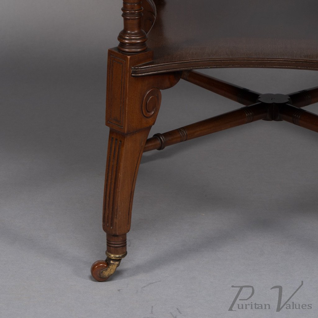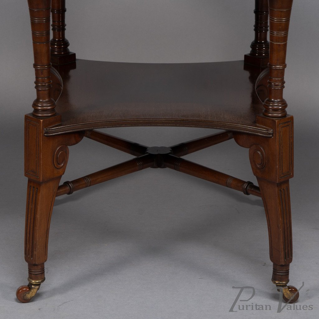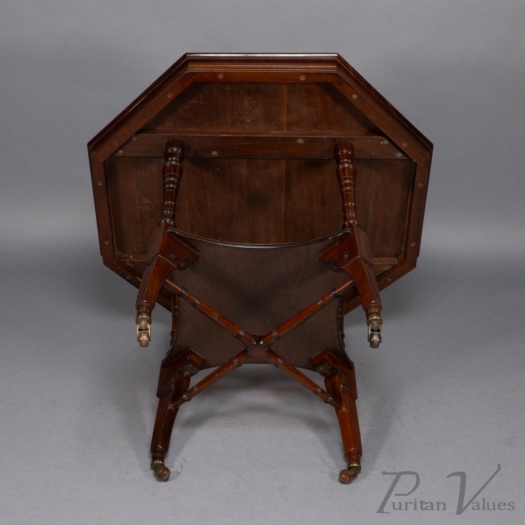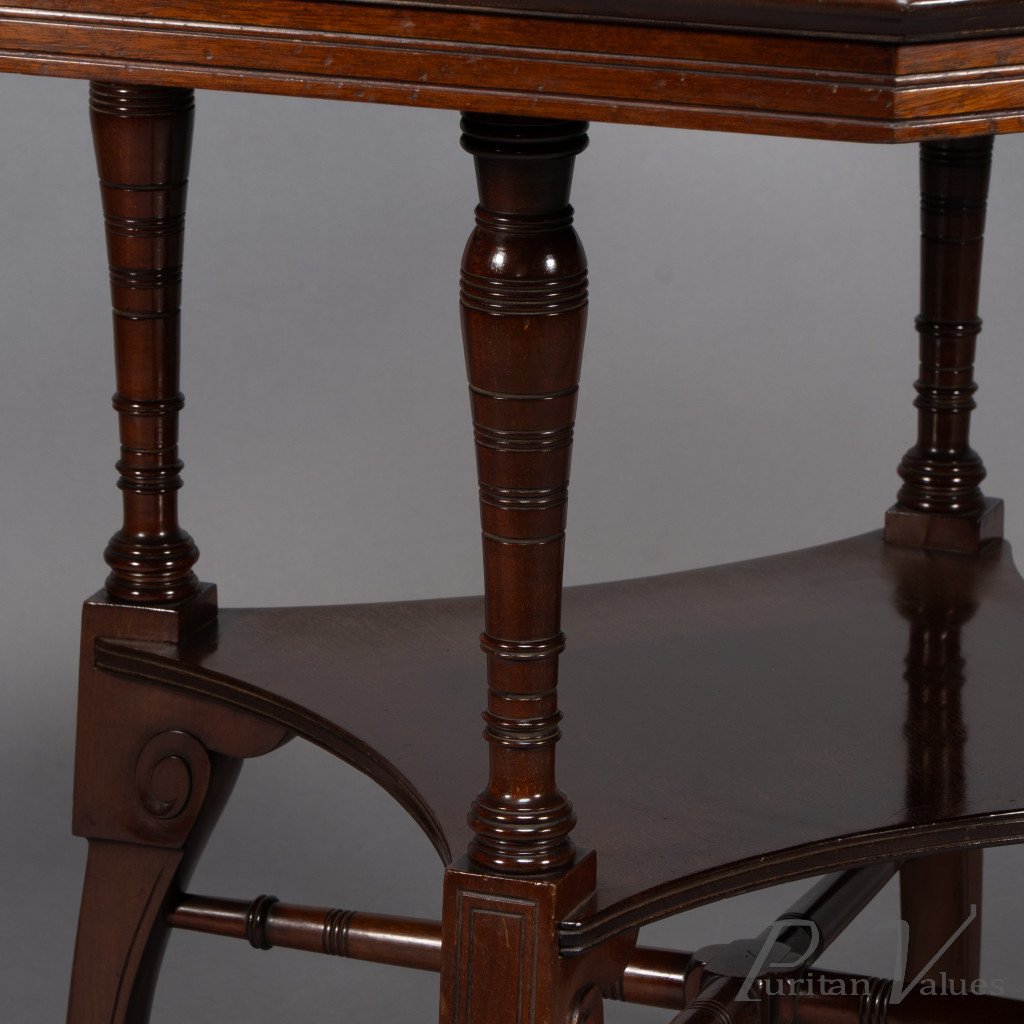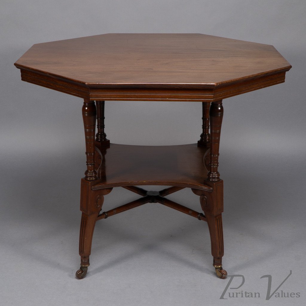 This Aesthetic Movement octagonal centre table attributed to Jas Shoolbred dates to around 1880 and exemplifies the refined domestic furniture that defined the late Victorian aesthetic. The octagonal top rests above an under-tier shelf supported by finely turned stretchers and elegant reeded legs, creating a harmony between geometry and proportion.
