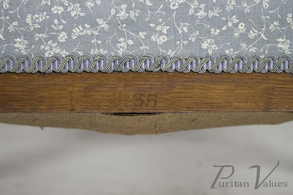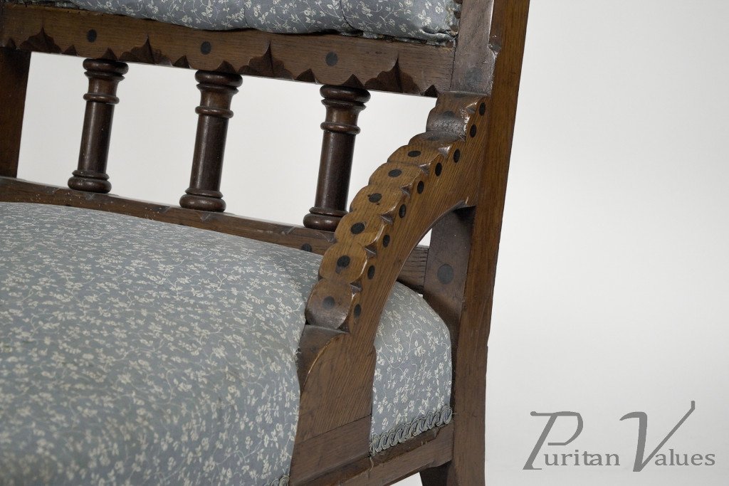 John Pollard Seddon attributed, probably made by C. Seddon in collaboration with Kenton and Co. A well designed architectural Gothic Revival oak upholstered nursing or low chair with ebonized circular decoration throughout and stylized floral details to the front rail and to the tops of the front legs. ( See Victorian and Edwardian Furniture and Interiors by Jeremy Cooper page 88 for a sideboard with many identical features to this chair). The buffet in image 2 has sold.