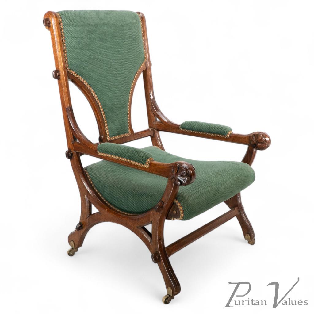 John Pollard Seddon attributed. A Gothic Revival oak armchair with through pegged tenon joints that have faceted edges to the ends of the tenon, a typical detail Seddon used often. The overall style and design has a good flow to it with soft chamfering to the frame edges. The arms have leaves carved into the ends and decorative brass castors to the feet.