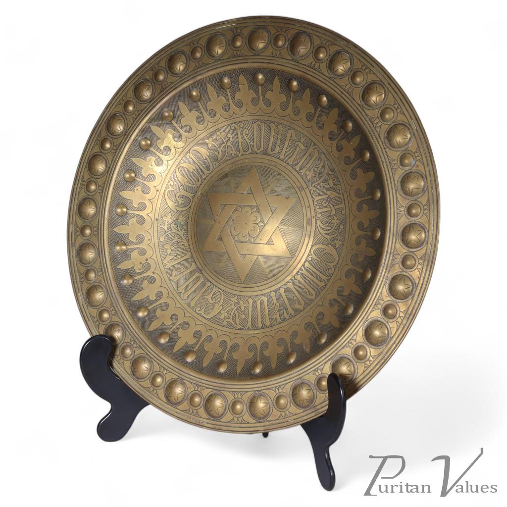 A fine quality heavy brass Alms plate engraved with a five pointed star and a flower to the centre with an inscription which reads: 'GOD LOVETH A CHEERFUL GIVER'.