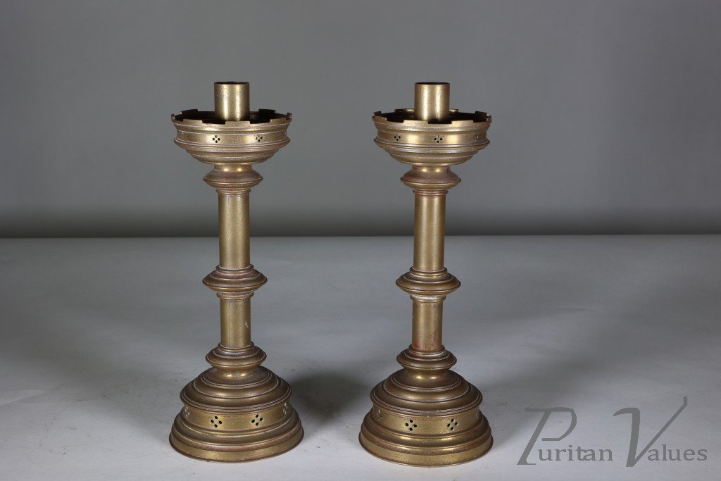 Jones & Willis – Pair of Gothic Revival Heavy Brass Castellated Candlesticks