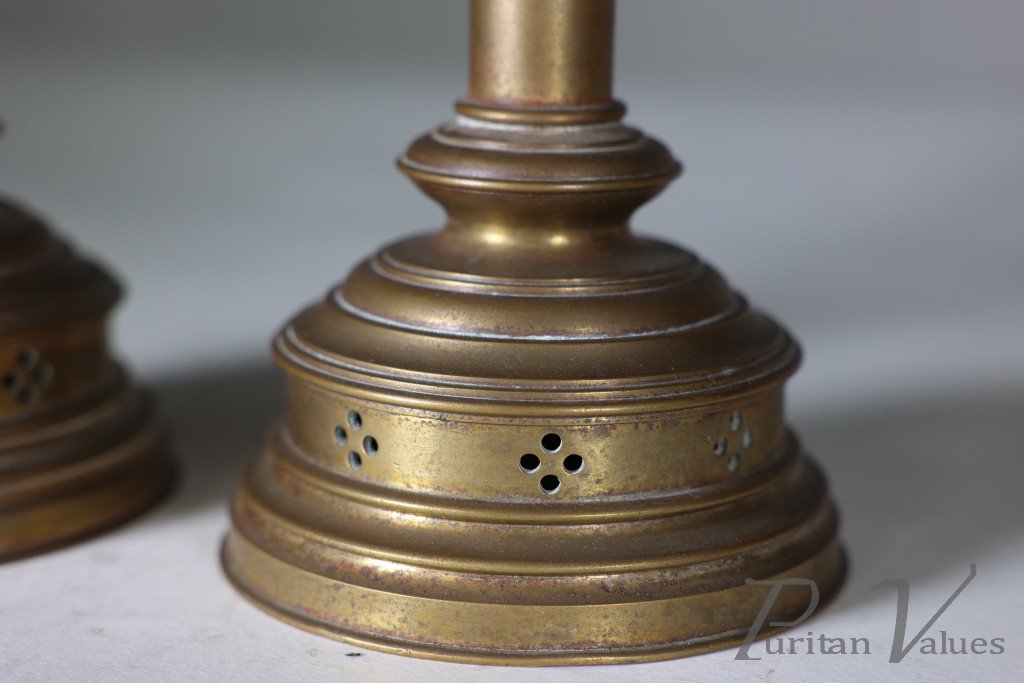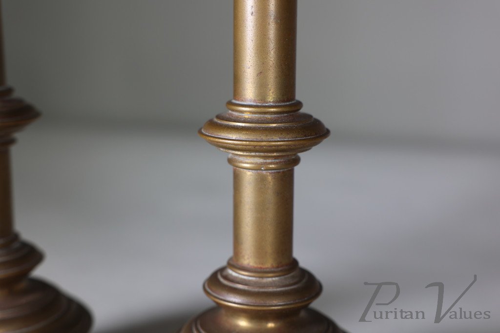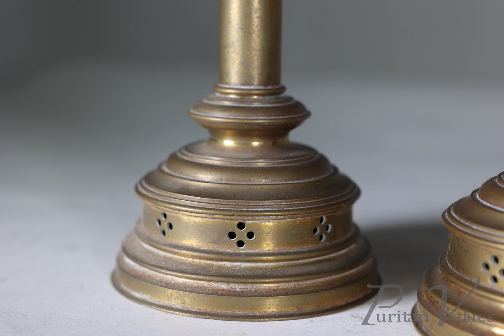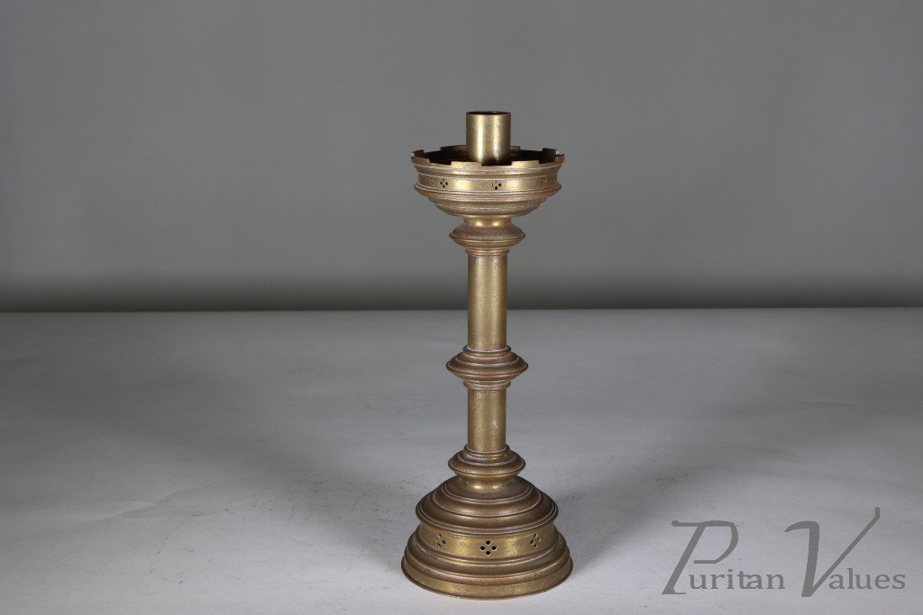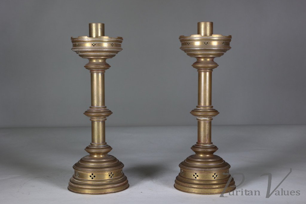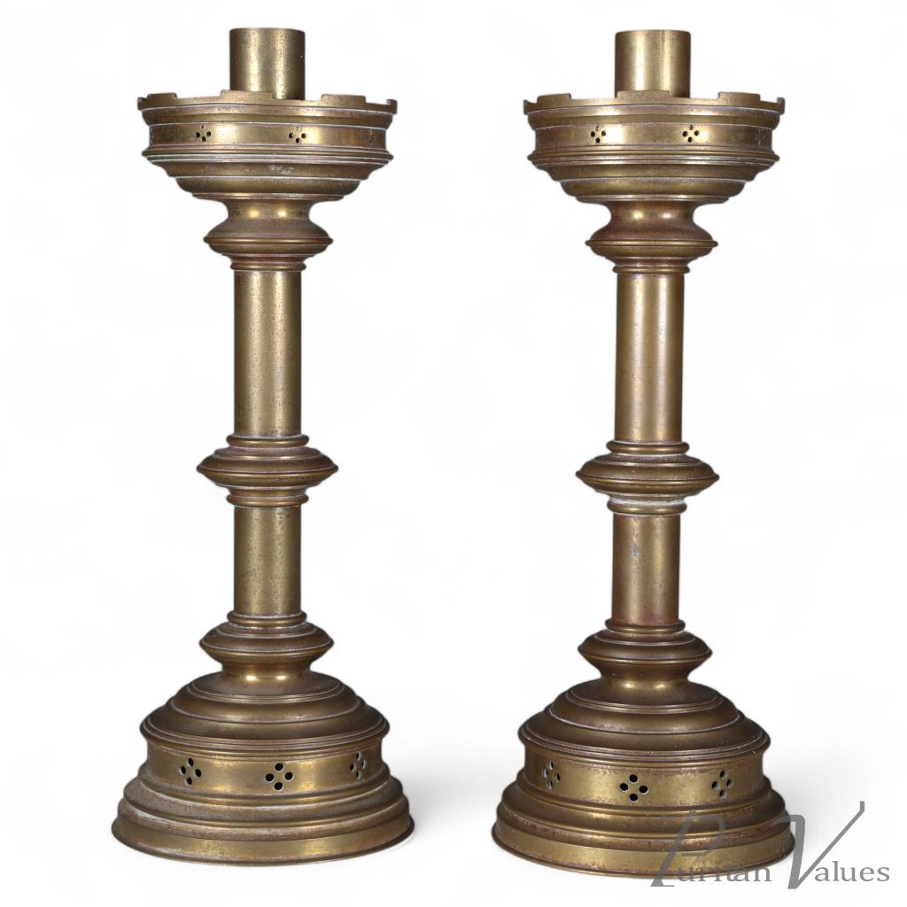 This pair of candlesticks, by Jones & Willis, exemplifies the Gothic Revival idiom of the late nineteenth century. Each is cast in heavy brass, rising from a circular base pierced with quatrefoil motifs and moulded in graduated tiers. The cylindrical column is defined by ringed turnings and culminates in a castellated nozzle, echoing the architectural ornament typical of ecclesiastical fittings of the period.