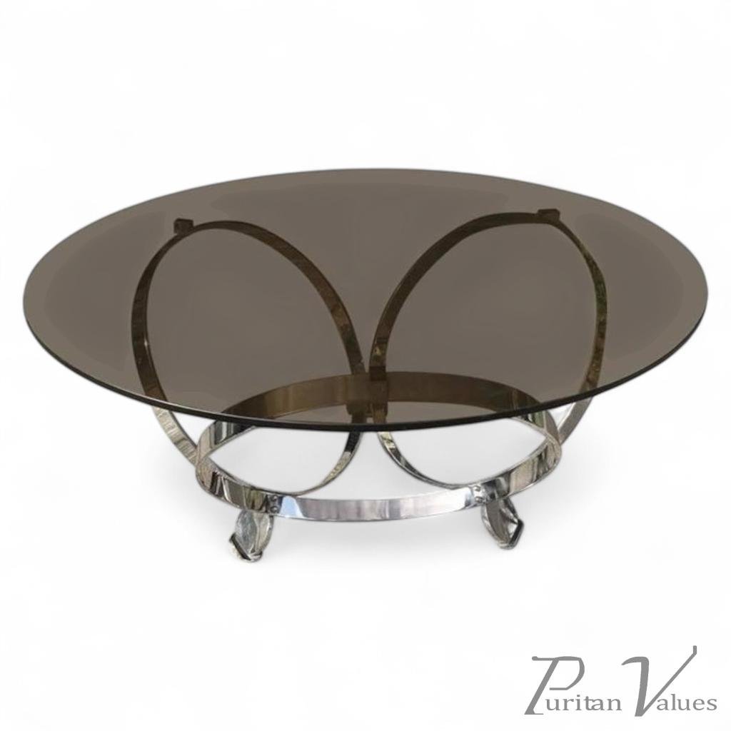 A modernist 1970s chrome and smoked glass coffee table with three circles joined together uniting to make a clever triple elliptical design that all stands on little pad feet.