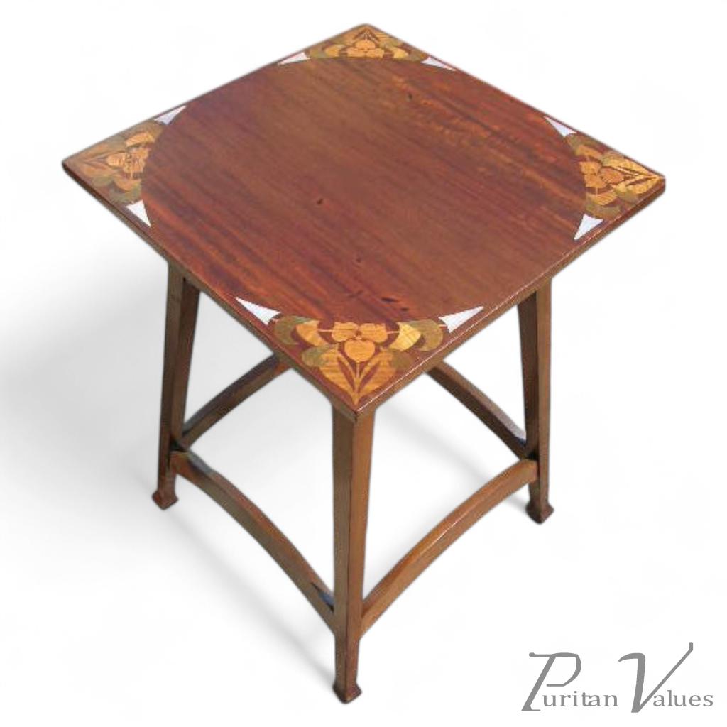 An Arts and Crafts mahogany sidetable with Mother of Pearl and fruitwood inlays to the top by Goodhall Lambs and Heighway. Height 26" and the top 18" square. Circa 1900.