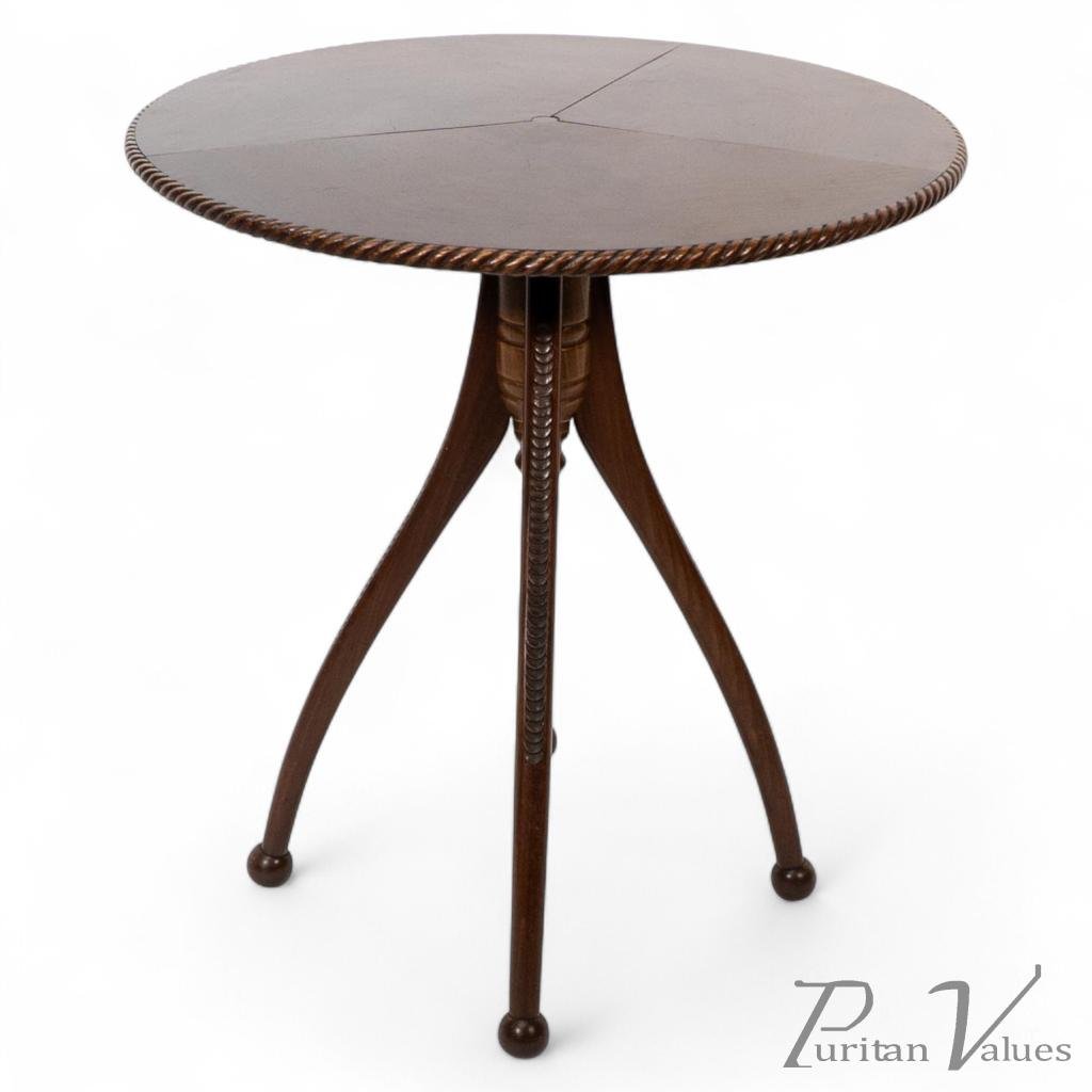 Charles Edward Horton for Lambs of Manchester attributed. A fine quality Aesthetic Movement Walnut circular wine table with a eight piece segmented top, and a rope twist moulding around the outer edge. The base with a small central pedestal with a lower finial that unites the four shaped legs to the top via a brass ring. Each leg with intricate feather carved decoration to the outer edges flowing down and standing on little ball feet. The top has some slight shrinkage to three of the joins. The whole is beautifully made and still very solid and stable.