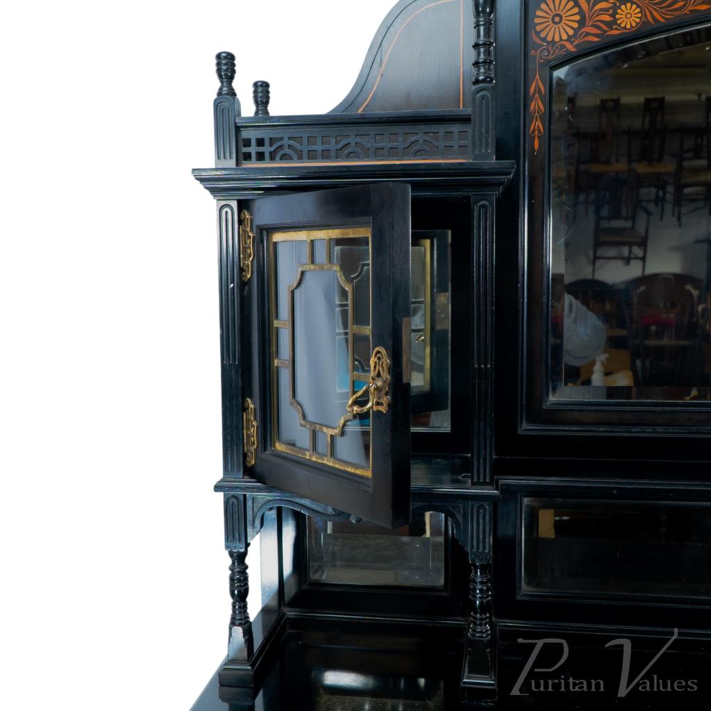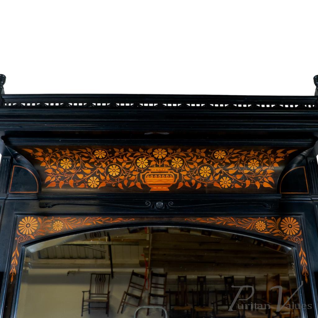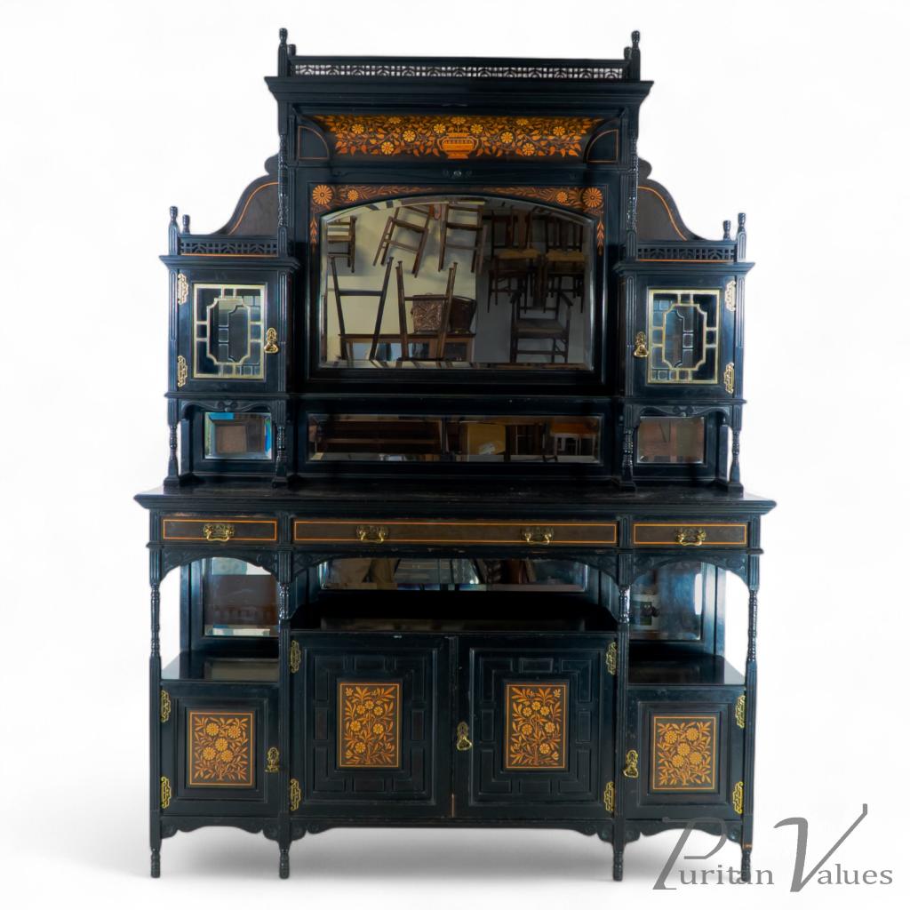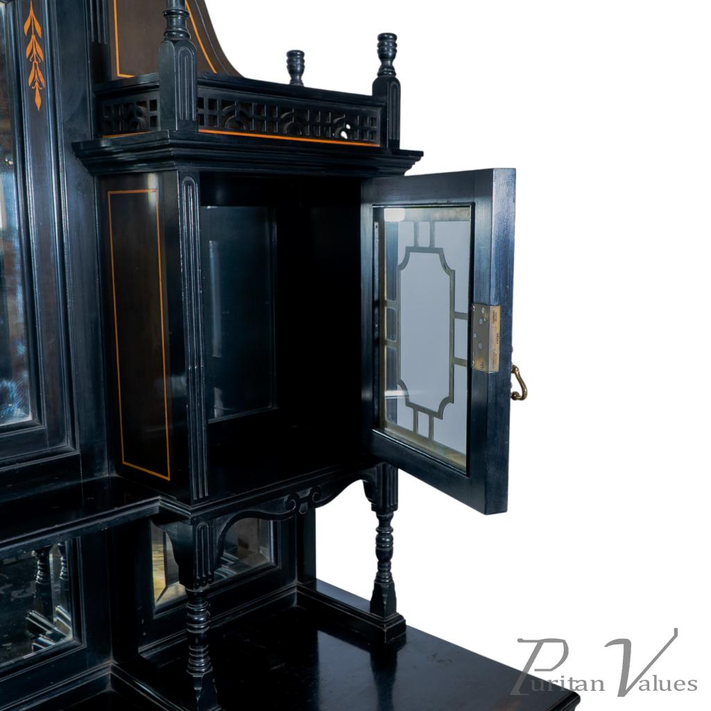 Attributed to Henry William Batley, probably for Gillows of Lancaster. A large Aesthetic Movement ebonized walnut cabinet with fine finials and a fretwork gallery to the top, and an arched canopy below with vibrant inlaid floral decoration and a central inlaid vase. A bevelled mirror sits beneath, with inlaid florets at each corner, flanked by open displays with fretwork galleries and conforming fine finials above glazed cupboards.