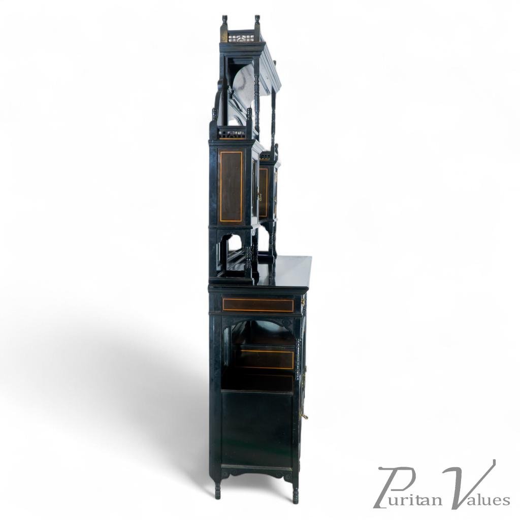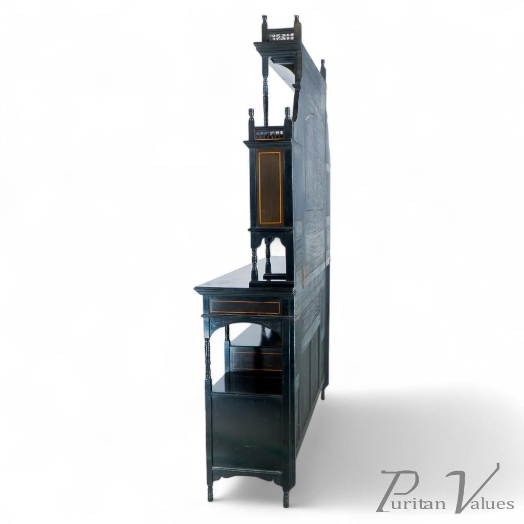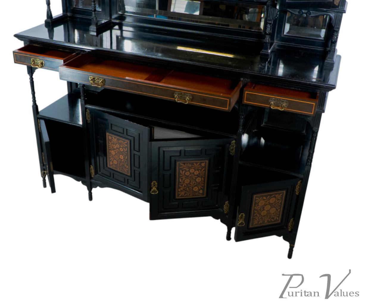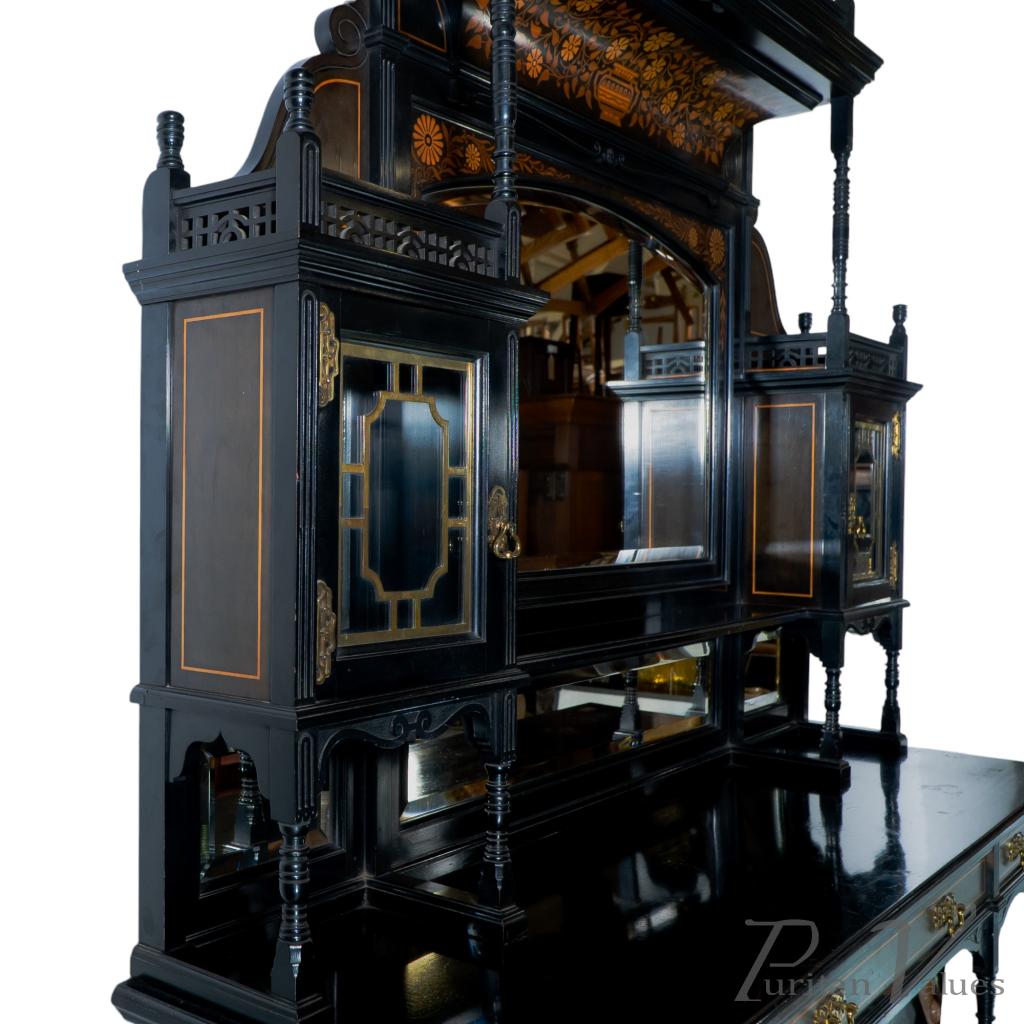 Attributed to Henry William Batley, probably for Gillows of Lancaster. A large Aesthetic Movement ebonized walnut cabinet with fine finials and a fretwork gallery to the top, and an arched canopy below with vibrant inlaid floral decoration and a central inlaid vase. A bevelled mirror sits beneath, with inlaid florets at each corner, flanked by open displays with fretwork galleries and conforming fine finials above glazed cupboards.