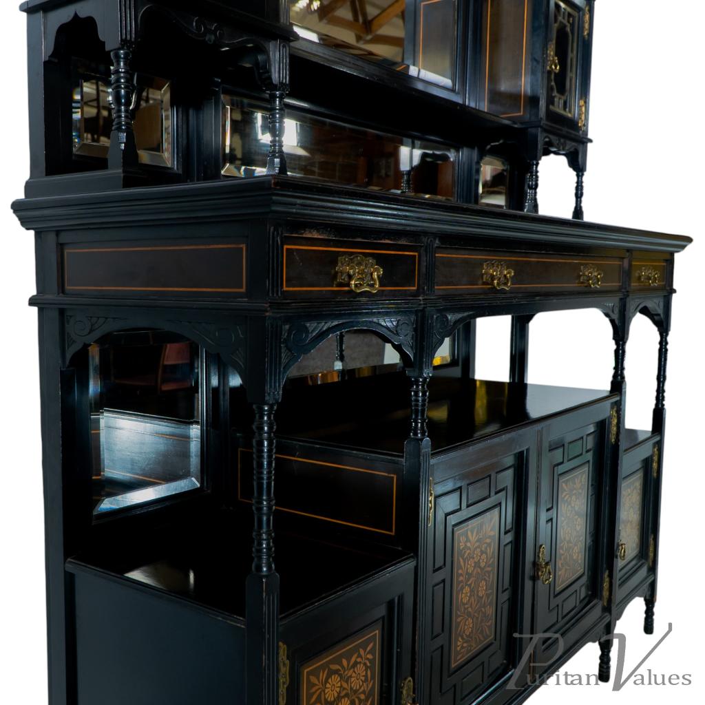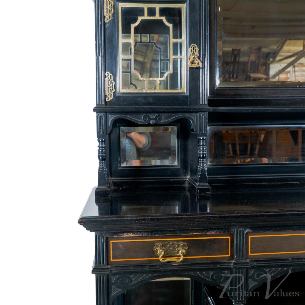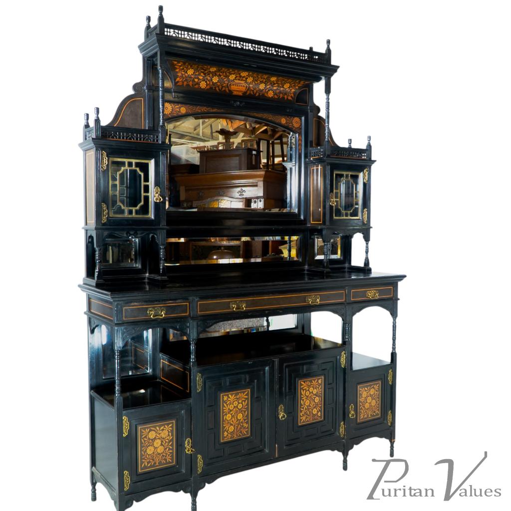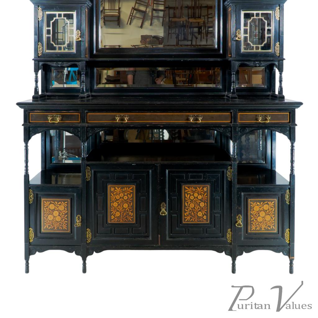 Attributed to Henry William Batley, probably for Gillows of Lancaster. A large Aesthetic Movement ebonized walnut cabinet with fine finials and a fretwork gallery to the top, and an arched canopy below with vibrant inlaid floral decoration and a central inlaid vase. A bevelled mirror sits beneath, with inlaid florets at each corner, flanked by open displays with fretwork galleries and conforming fine finials above glazed cupboards.
