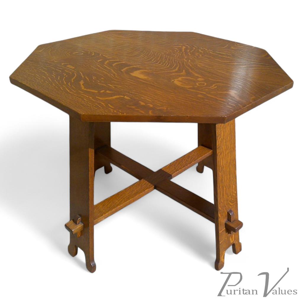 A Liberty and Co Octagonal centre table designed by Leonard Wyburd with through pegged construction a pure design classic with it's original ivorene label. Height 28", Width 36". Circa 1890.
