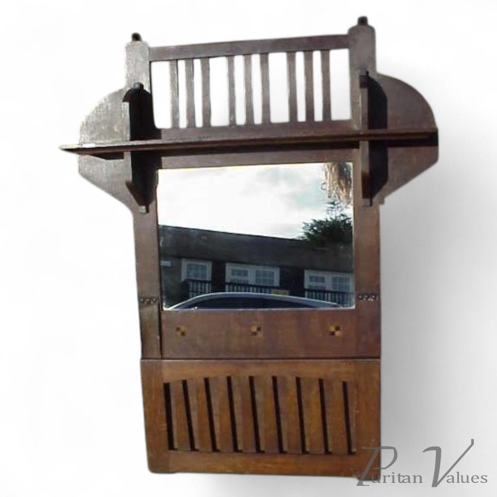 A rare Liberty and Co Arts and Crafts oak wall mirror/paper rack, with square boxwood and Ebony inlays just above the slatted shaped rack which is secured by leather straps so it will fall forward to accept papers and an upper shelf just below further slatted details, the design attributed to Leonard Wyburd. Height 35", Width 27 1/2", Depth of shelf 4 1/2". Circa 1890's.