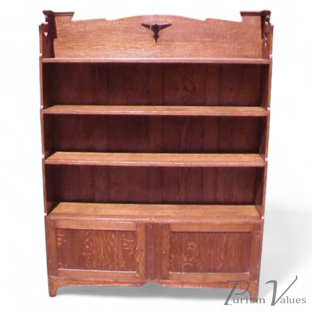A Liberty and Co oak Bookcase with a pair of cupboards below, graduating inwards to the top and open shelves. Height 65", Length 49", Depth 11". Circa 1895.