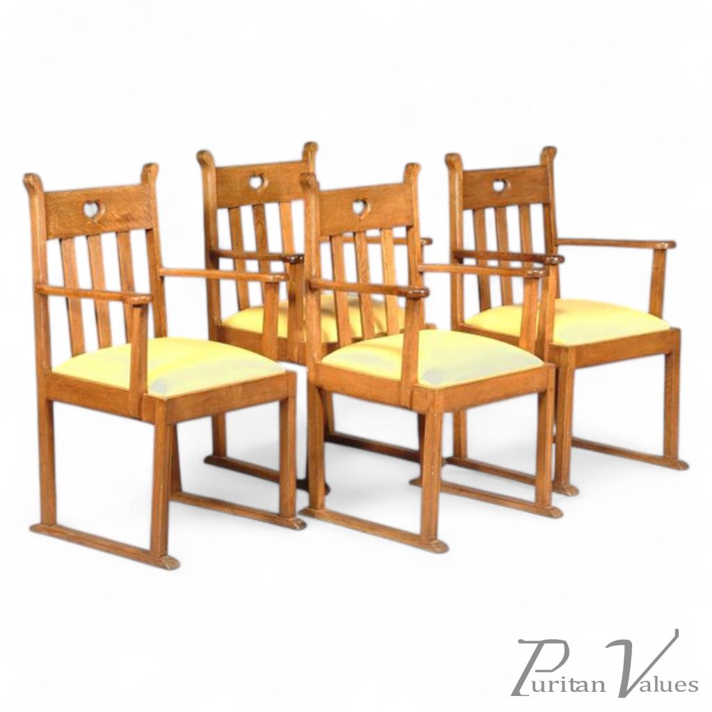 Liberty and Co. (attributed), (Two available two now sold). A pair of oak armchairs, in the manner of E. Punnett, with heart cut-outs, re-upholstered drop-in seats, sled feet, 97cm high.