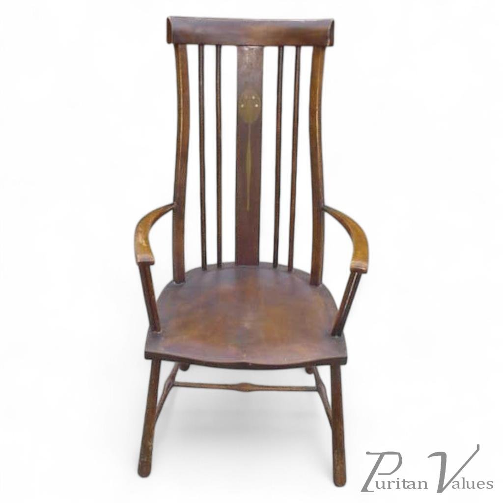 A rare Arts and Crafts Liberty and Co armchair a variation is shown in the Liberty style book with sylised inlay, superb shaped back supports with twin turned arm supports a wonderful flowing lines, the inlay possibly after a design by Ballie Scott. Circa 1900.