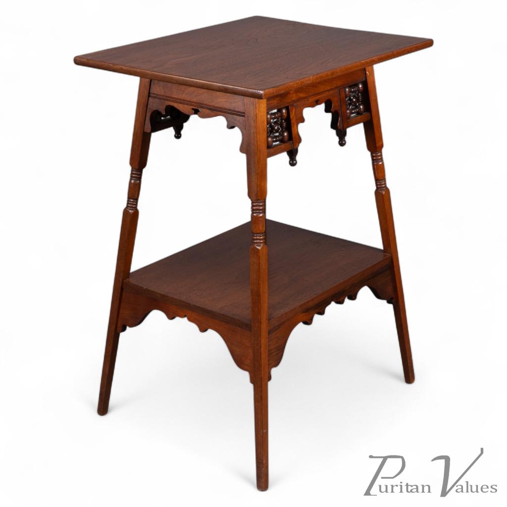 It stands on square tapering legs with turned details to the upper section, united by a lower shelf with conforming Moorish arches.