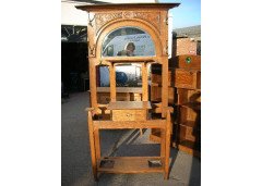 An Arts and Crafts oak Hallstand attributed to Liberty and Co with shaped top, ying yang cutouts central mirror with a shelf and a drawer below flanked by heart cut-outs and further heart cut-outs with further shelves below and a central drip tray.