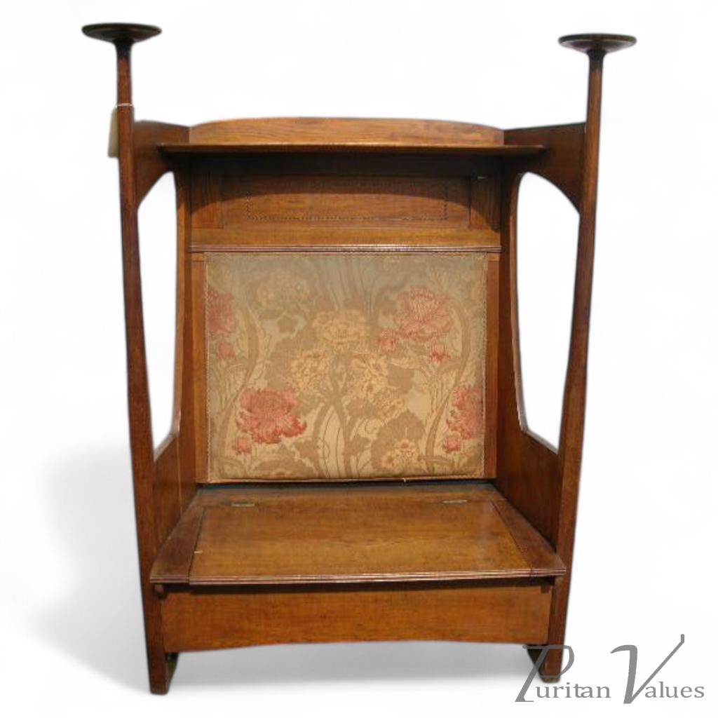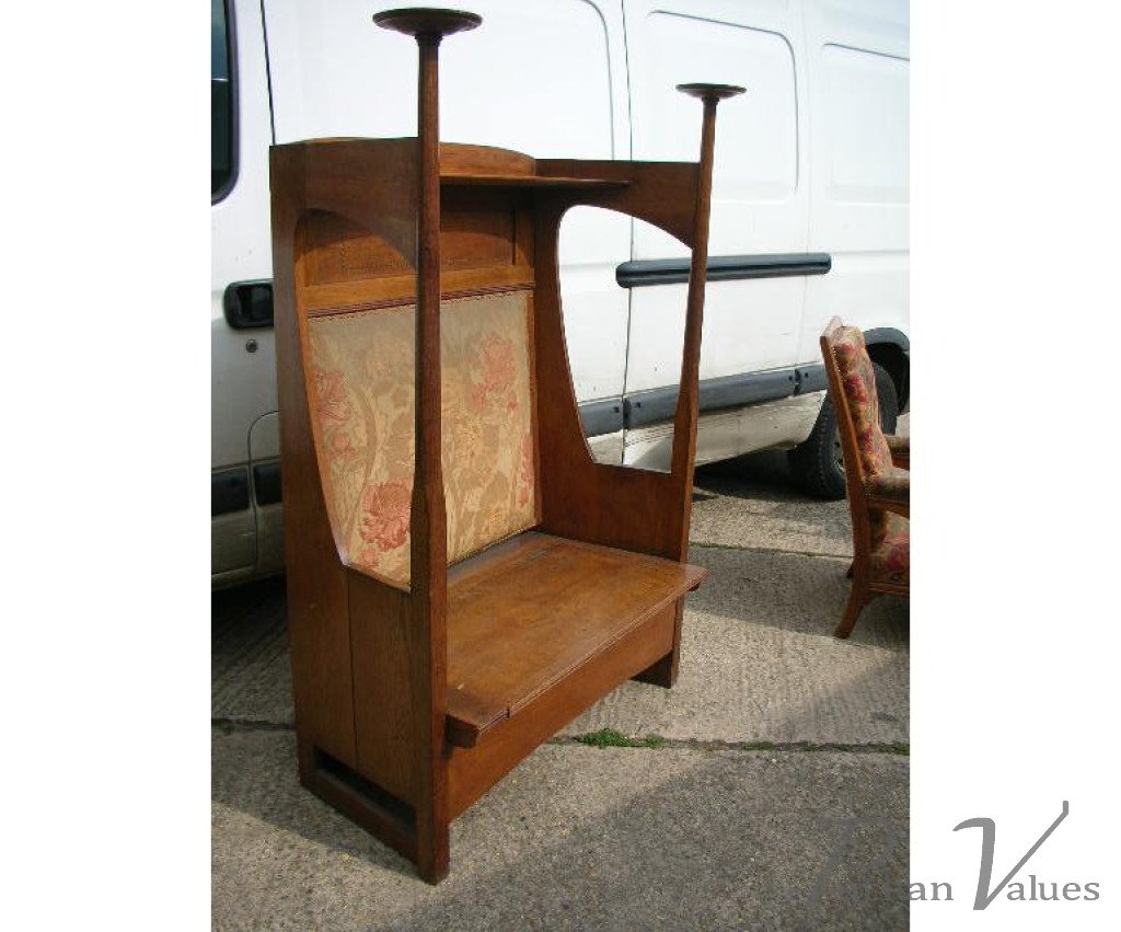 An Arts and Crafts oak settle in the style of CFA Voysey, retaining it's original Arts and Crafts fabric, the fabric attributed to The Silver Studio's for Liberty and Co,. lifts up seat with storage below. Last three images showing the fabric designs Height to top of disc's 66", Width from disc to disc 50", Width at the back 37", Depth 24". £ SOLD
