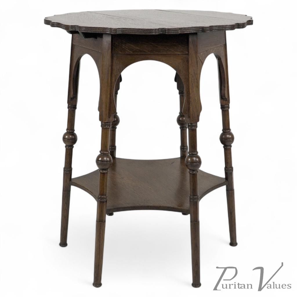 Liberty and Co. An Arts and Crafts oak side or occasional table with a shaped top and molded edges. Six legs with bulbous details uniting with a lower spider web shaped shelf. With original enamel Liberty label underneath the top.