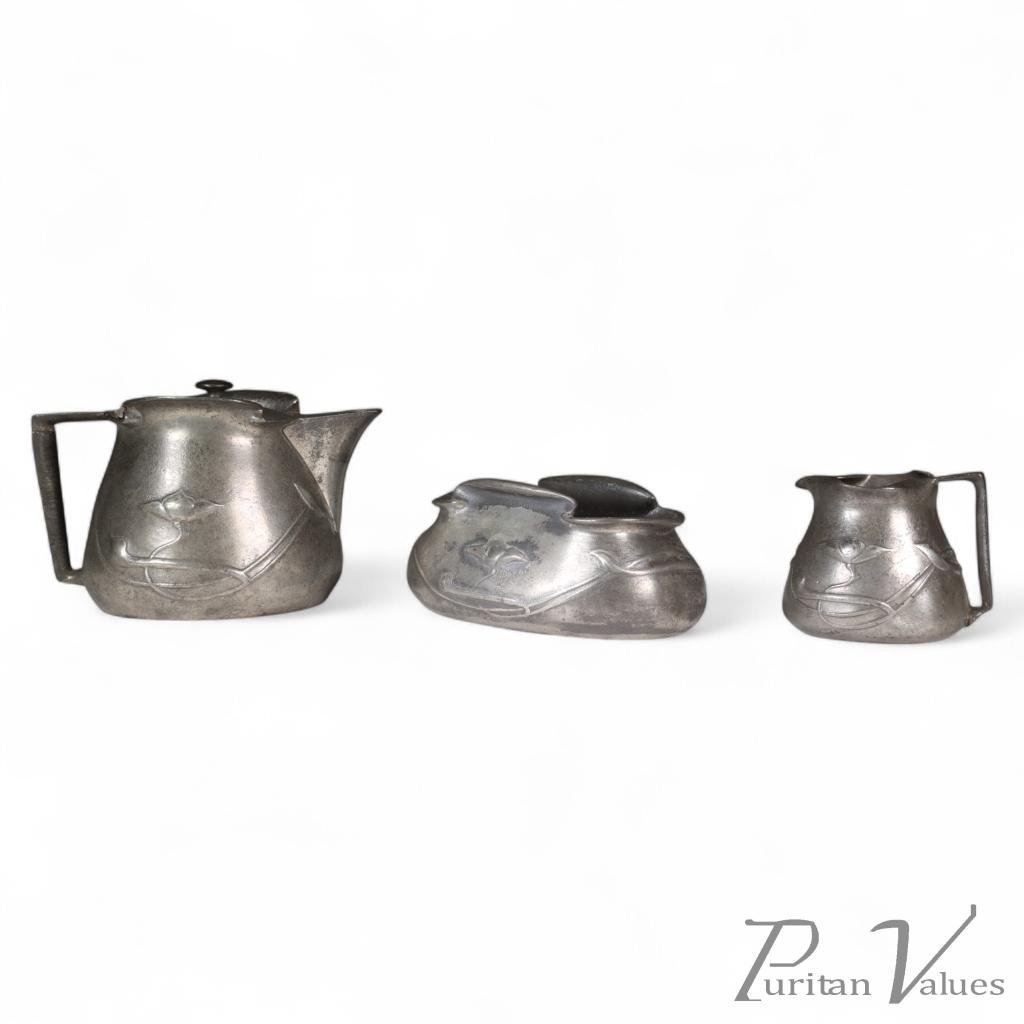 All three pieces stamped Tudric 025. An Arts and Crafts three-piece tea set with floral decoration.