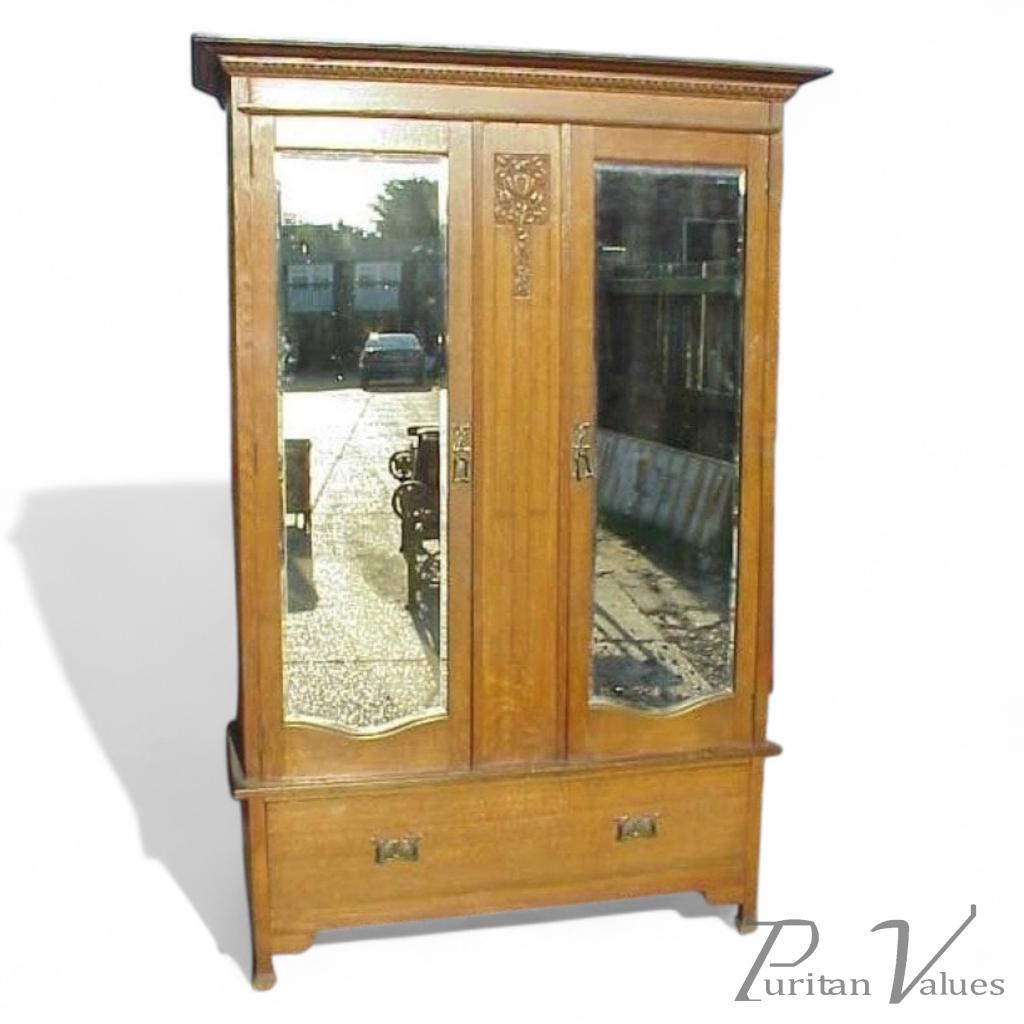 Liberty & Co., oak Arts and Crafts three piece bedroom suite, with wonderful stylised floral carved details to wardrobe and dressing table, shaped bevelled mirrors, and exquisite tiles to washstand back. Stamped L& Co., on all the handle drops.
