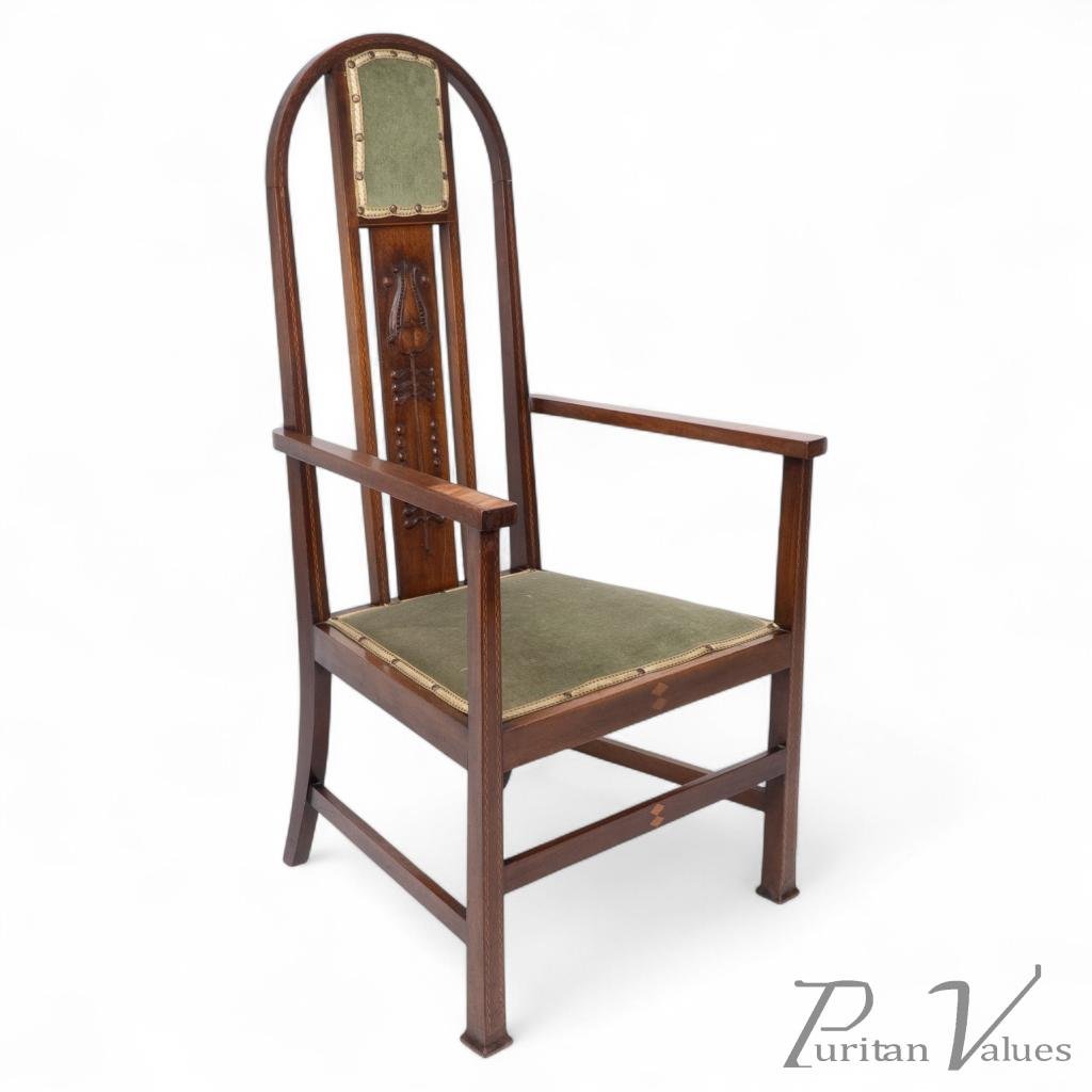 Liberty and Co attri, An Arts and Crafts mahogany armchair, with carved stylized plant motif to the central splat fland by chequered ebony and boxwood stringing and inlaid Walnut strips to the arms with double diamond inlay to the front seat rail and stretcher.