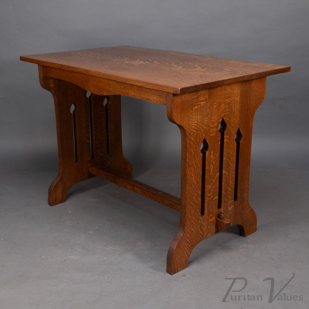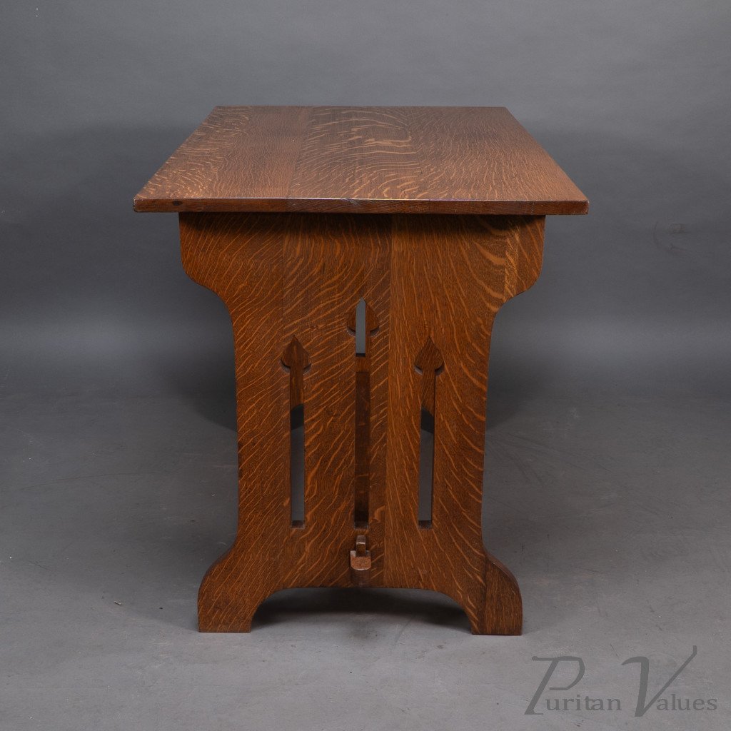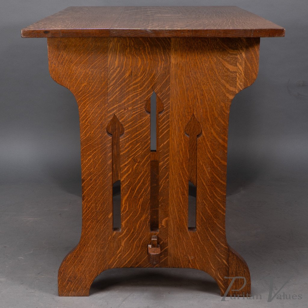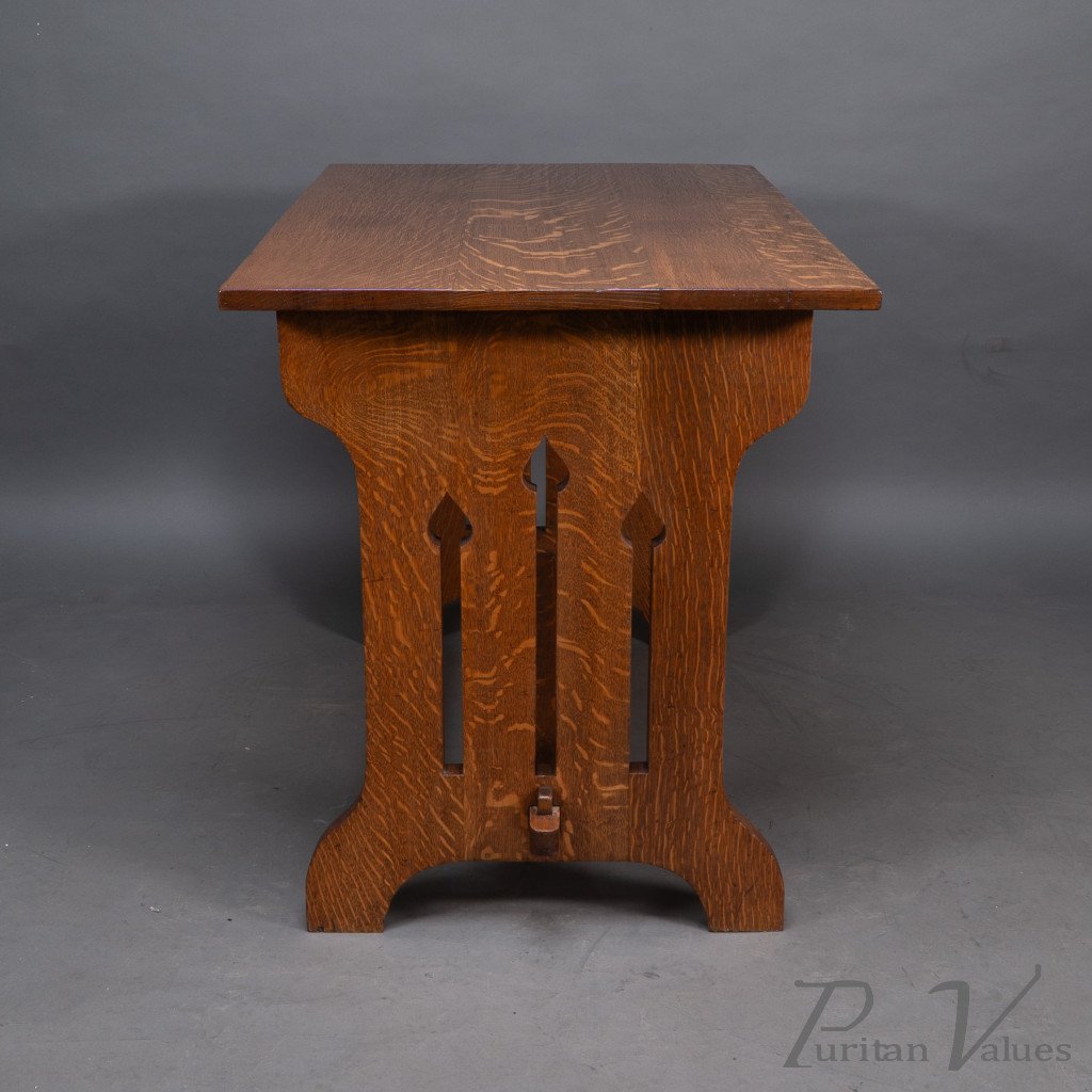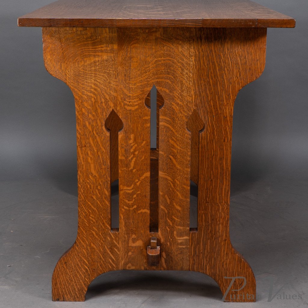 An Arts and Crafts quarter sawn oak dining or library table showing good figuring to the grain, with three vertical tulip style cut-outs to each end. The stretcher with through pegged joints.
