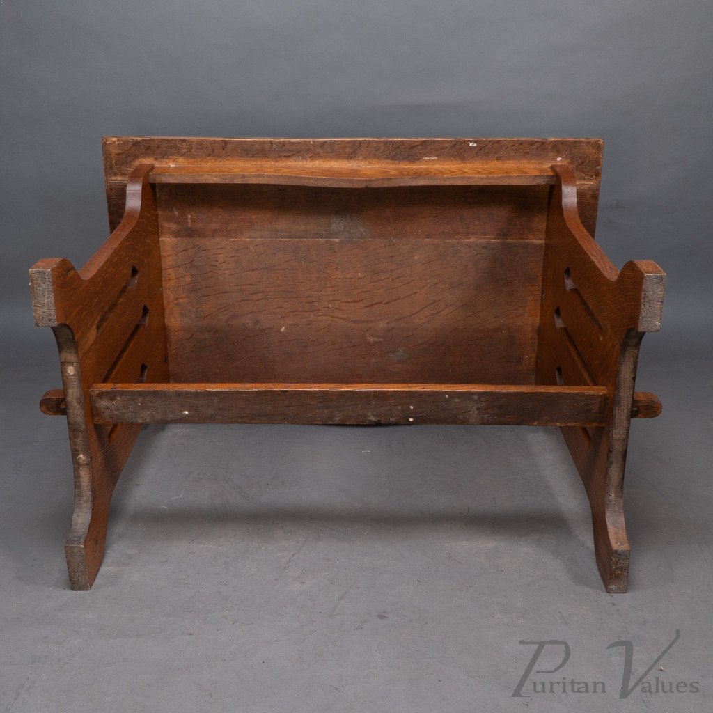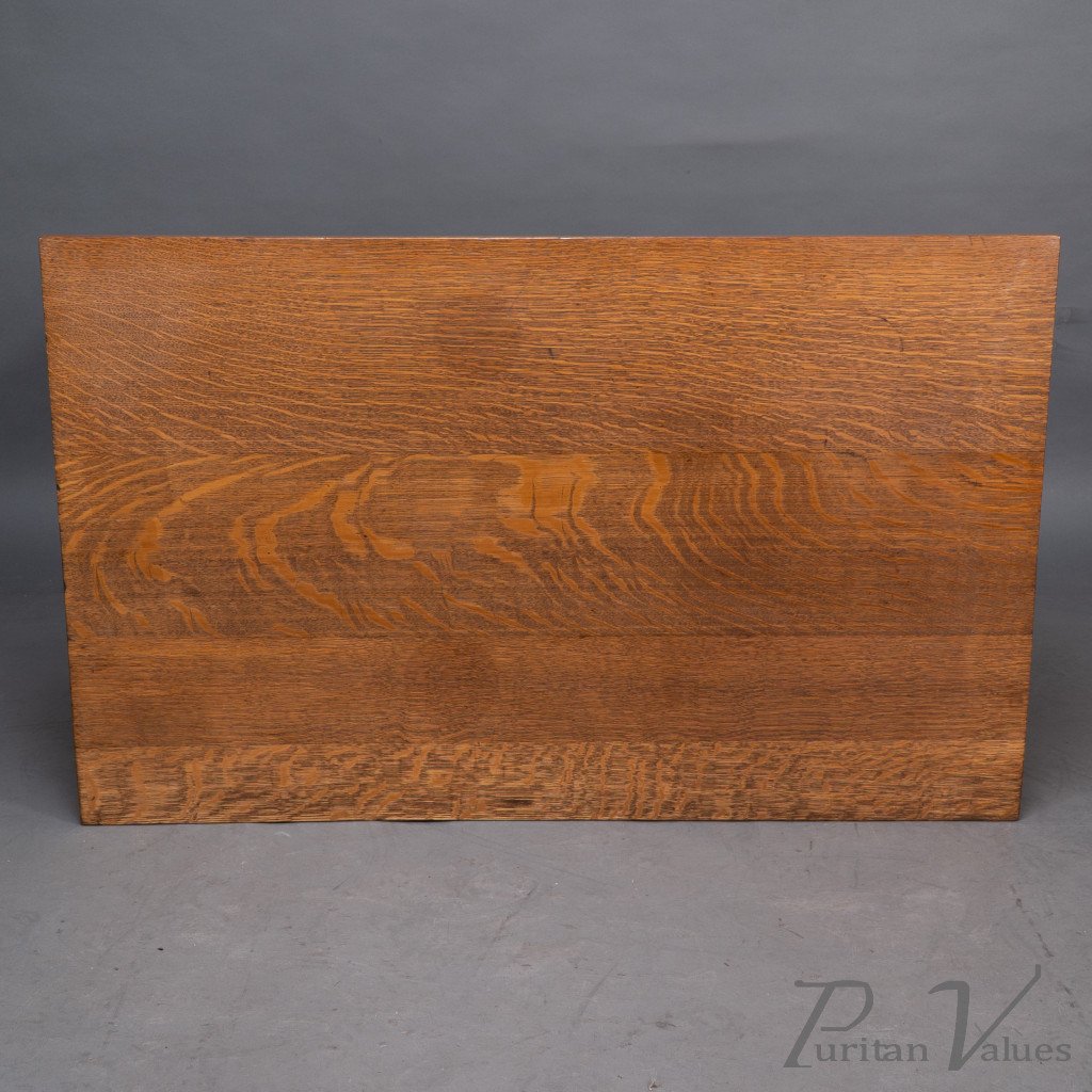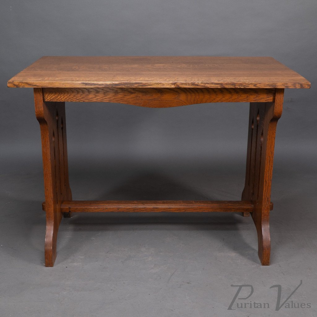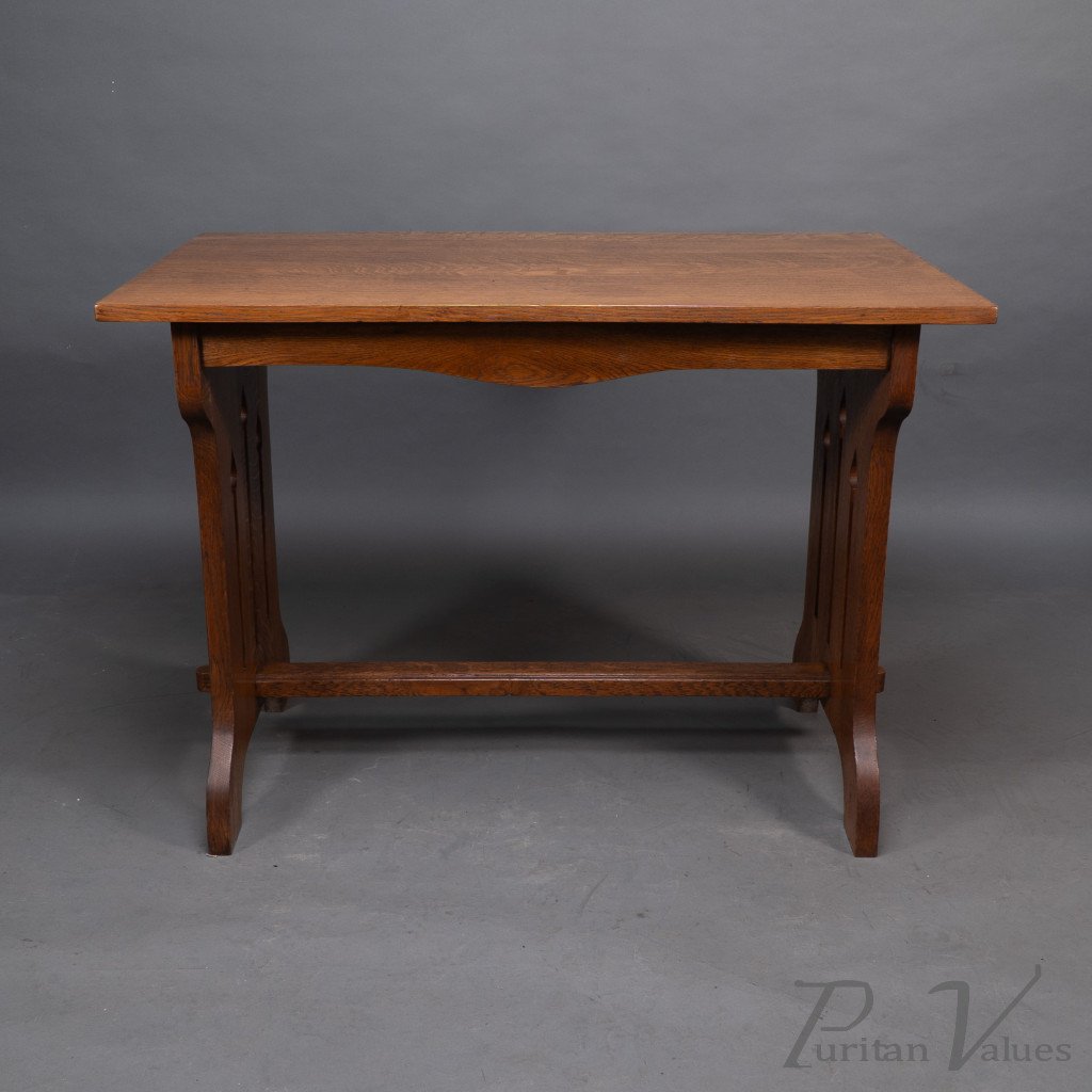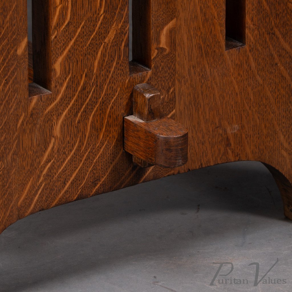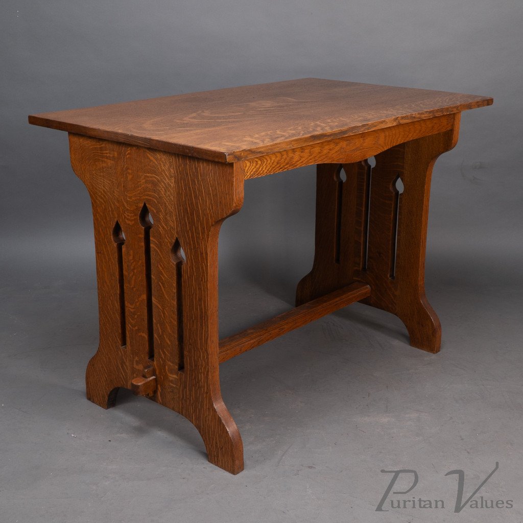 An Arts and Crafts quarter sawn oak dining or library table showing good figuring to the grain, with three vertical tulip style cut-outs to each end. The stretcher with through pegged joints.