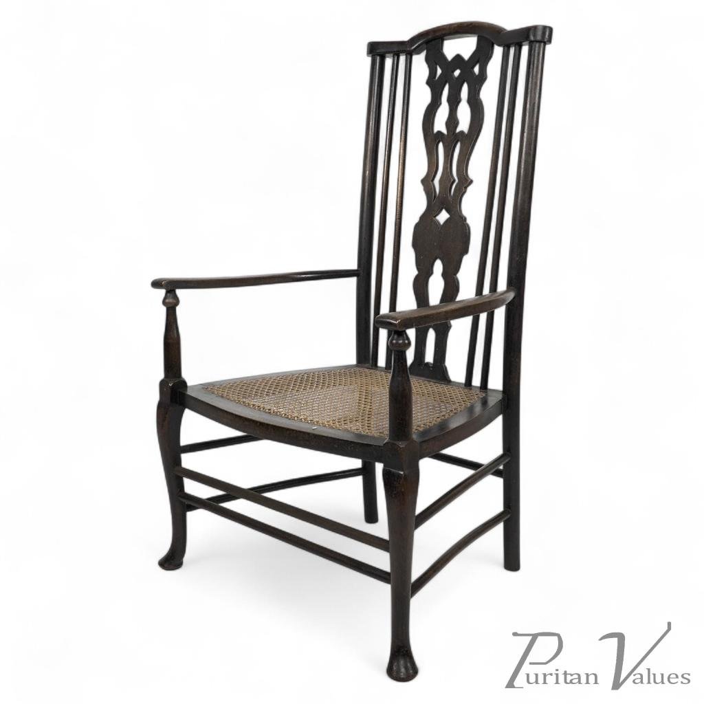 Liberty and Co attributed. A traditional Queen Anne style parlour chair with fretwork back, cane seat and Queen Anne cabriole front legs. A similar form is illustrated in Liberty's Yule Tide Gift Catalogues.