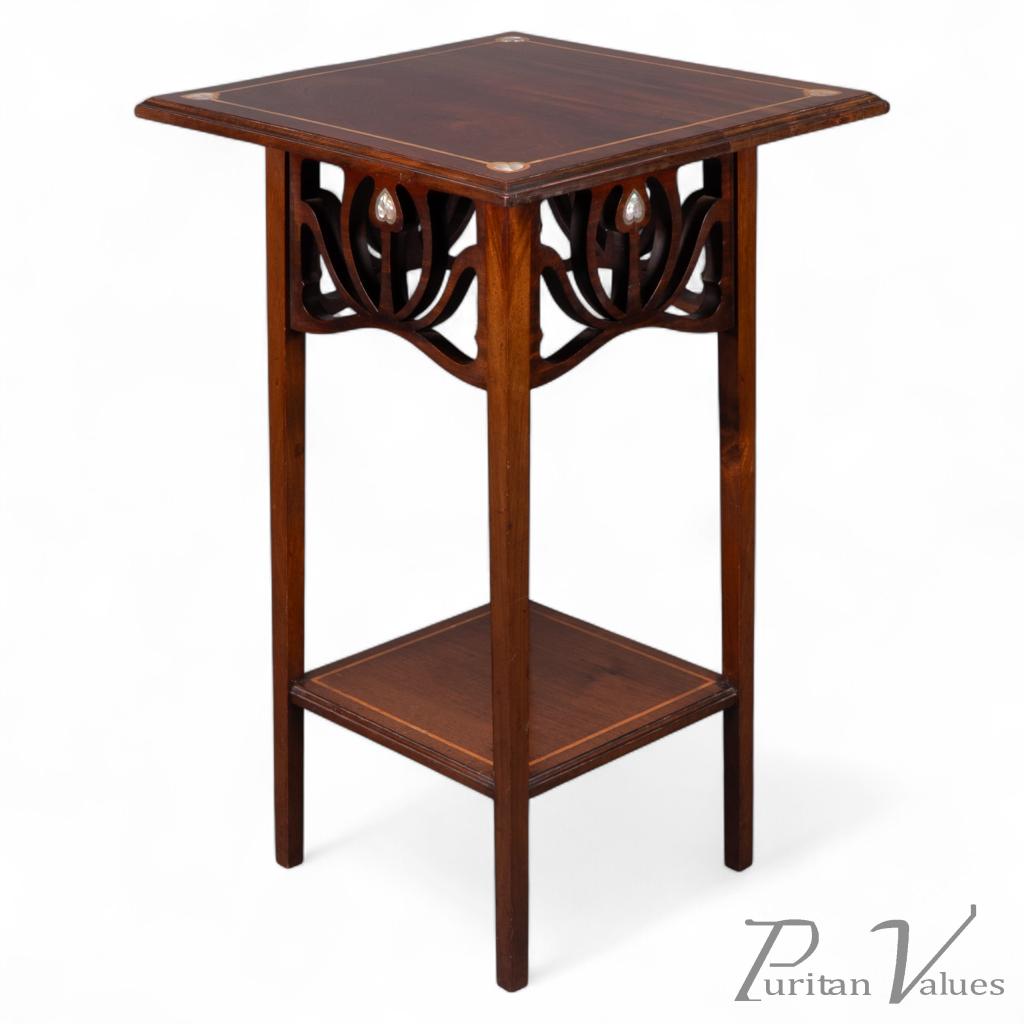 An Arts and Crafts Mahogany occasional table with Mother-Of-Pearl hearts inlaid to the four corners of the molded top united by Sycamore line inlays, with an Art Nouveau flowing fretwork decoration below to each side, each centred with an upright and further Mother-Of-Pearl heart inlays.