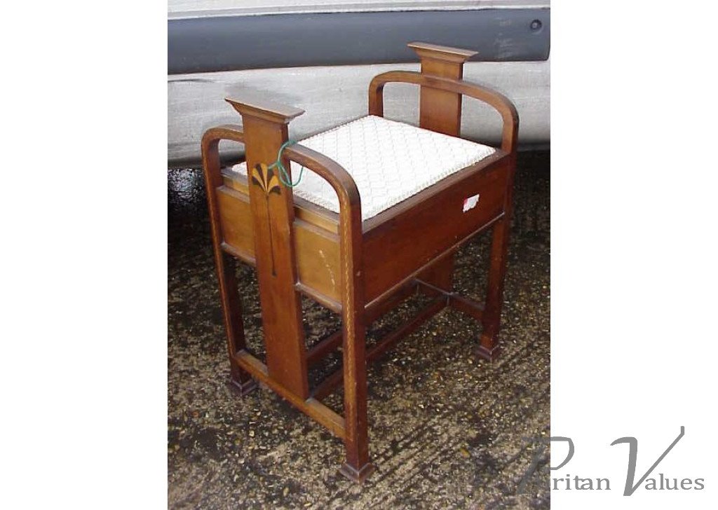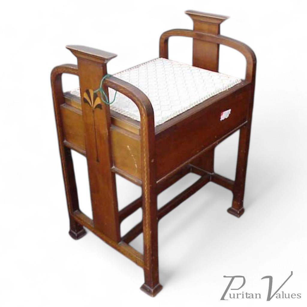 An Arts and Crafts walnut piano stool attributed to Liberty and Co, with wonderful stylised floral inlays to the sides and chequered inlays to the legs and cross stretchers with lift up seat for storing music sheets. Height 26", Length 18 1/2", Depth 14". Circa 1900.