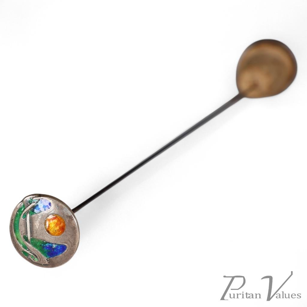 An Arts and Crafts silver hat pin with Celtic decoration touched with blue, orange, and green enamel to the end, on a long steel pin.